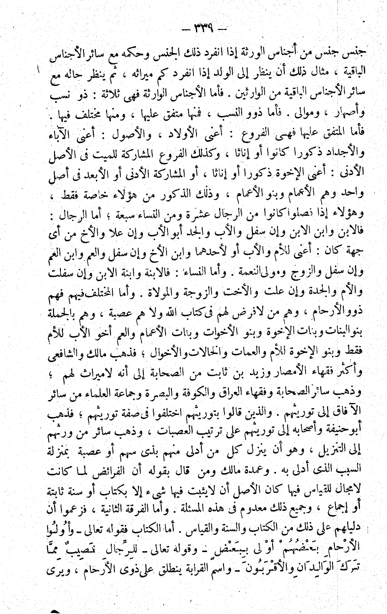 فأما الأجناس الوارثة فهي ثلاثة ذو نسب وأصهار وموالي فأما ذو النسب فمنها متفق عليها ومنها مختلف فيها.
