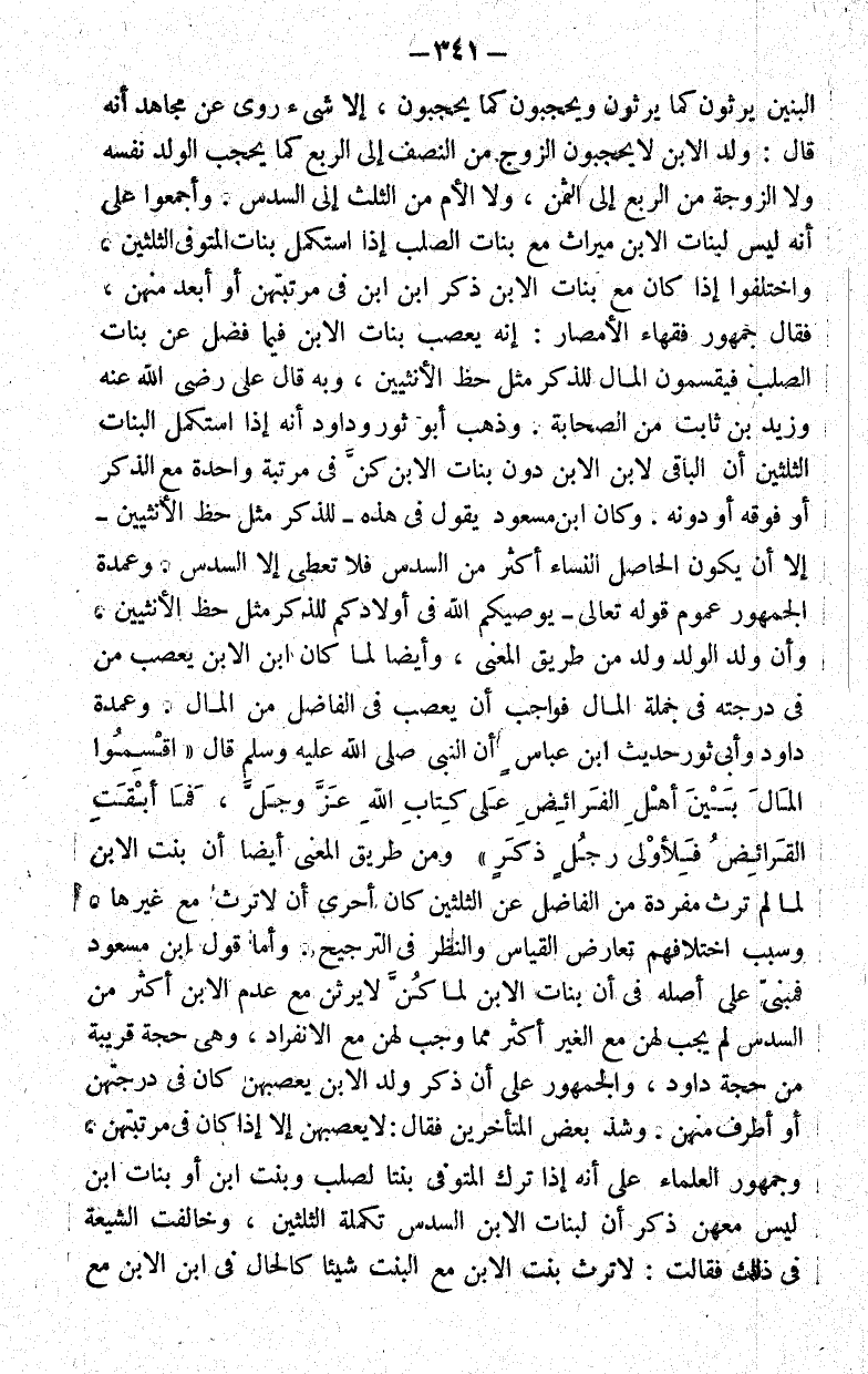 وشذ بعض المتأخرين فقال لا يعصبهن إلا إذا كان في مرتبتهن وجمهور العلماء على أنه إذا ترك المتوفى بنتا لصلب وبنت ابن أو بنات ابن ليس معهن ذكر أن لبنات الابن السدس تكملة الثلثين وخالفت الشيعة في ذلك فقالت لا ترث بنت الابن مع البنت شيئا كالحال في ابن الابن مع