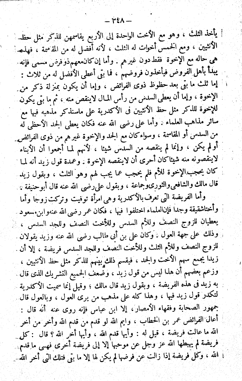 وأما الفريضة التي تعرف بالأكدرية وهي امرأة توفيت وتركت زوجا وأما وأختا شقيقة وجدا فإن العلماء اختلفوا فيها فكان عمر رضي الله عنه وابن مسعود يعطيان للزوج النصف وللأم السدس وللأخت النصف وللجد السدس وذلك على جهة العول.
