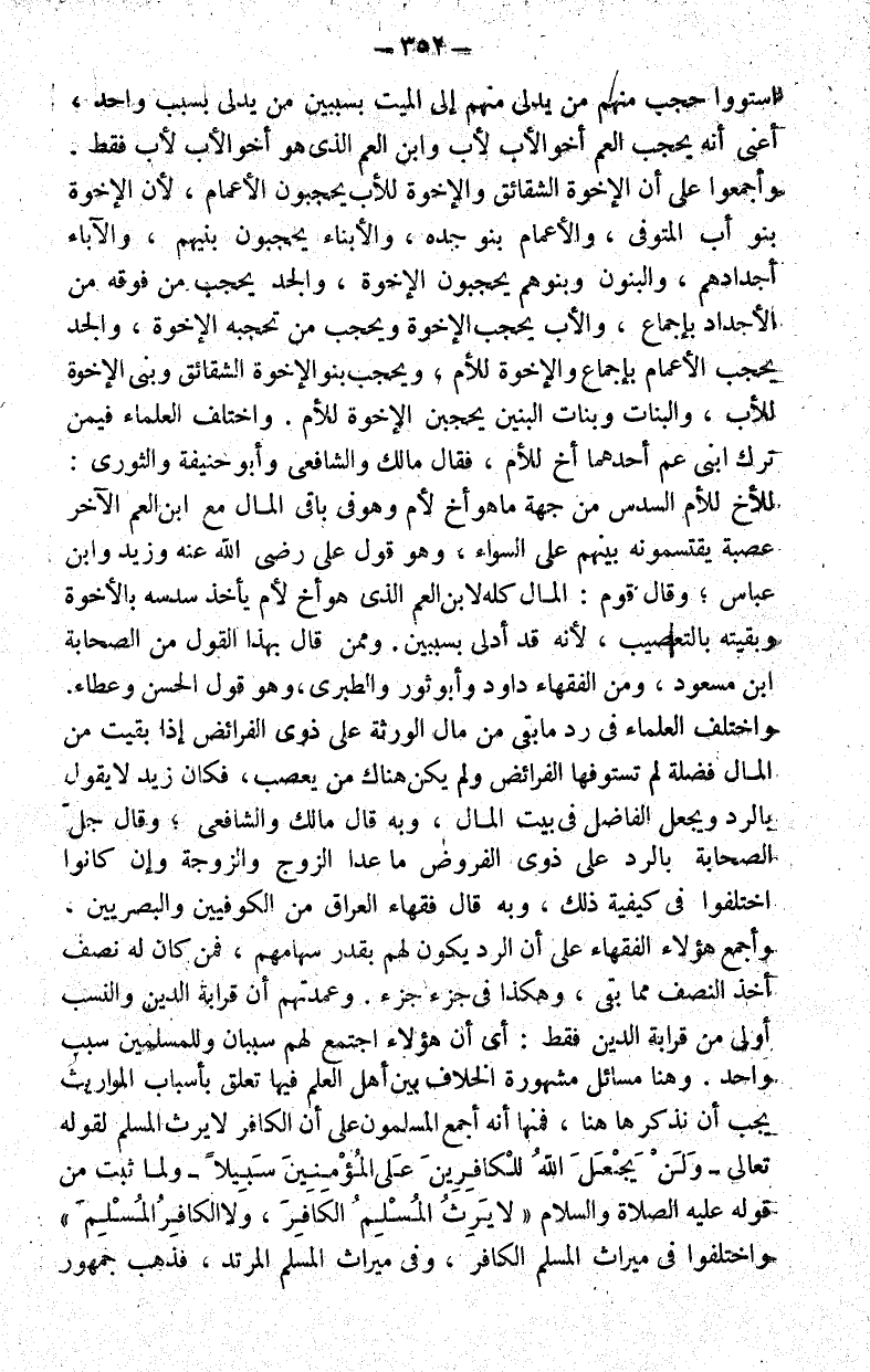 المتوفى والأعمام بنو جده والأبناء يحجبون بنيهم والآباء أجدادهم والبنون وبنوهم يحجبون الإخوة والجد يحجب من فوقه من الأجداد بإجماع والأب يحجب الإخوة ويحجب من تحجبه الإخوة والجد يحجب الأعمام بإجماع والإخوة للأم ويحجب بنو الإخوة الشقائق بني الإخوة للأب.