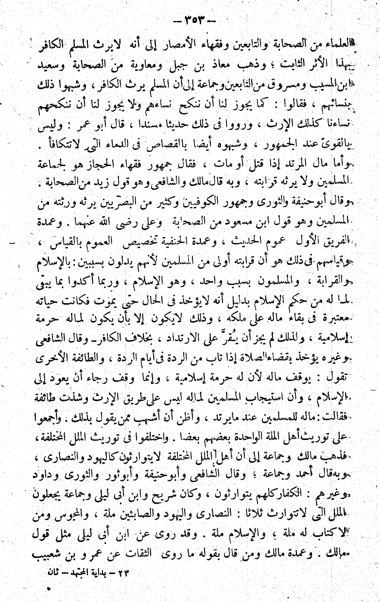 العلماء من الصحابة والتابعين وفقهاء الأمصار إلى أنه لا يرث المسلم الكافر بهذا الأثر الثابت وذهب معاذ بن جبل ومعاوية من الصحابة و سعيد بن المسيب ومسروق من التابعين وجماعة إلى أن المسلم يرث الكافر وشبهوا ذلك بنسائهم فقالوا كما يجوز لنا أن ننكح نساءهم ولا يجوز لنا أن ننكحهم نساءنا كذلك الإرث ورووا في ذلك حديثا مسندا قال أبو عمر وليس بالقوي عند الجمهور وشبهوه أيضا بالقصاص في الدماء التي لا تتكافأ.