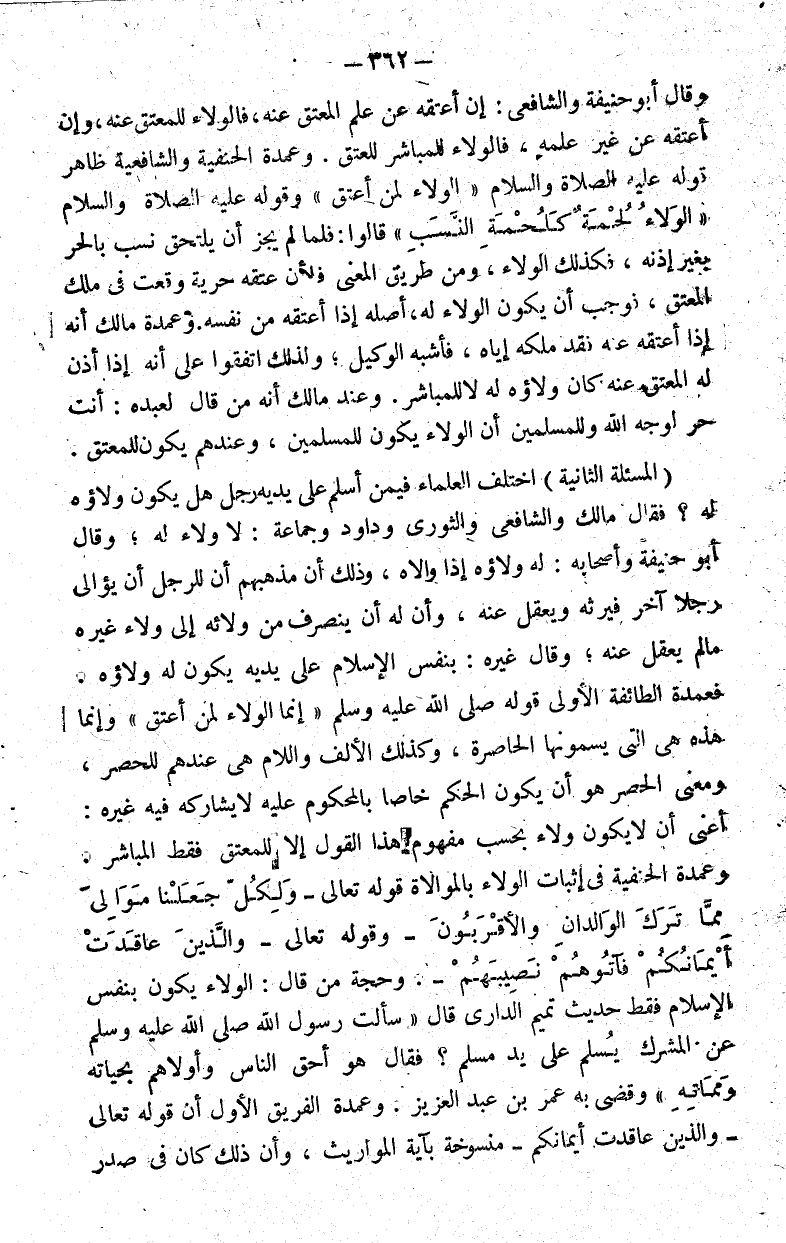 فعمدة الطائفة الأولى قوله صلى الله عليه وسلم "إنما الولاء لمن أعتق" وإنما هذه هي التي يسمونها الحاصرة وكذلك الألف واللام هي عندهم للحصر ومعنى الحصر هو أن يكون الحكم خاصا بالمحكوم عليه لا يشاركه فيه غيره أعني أن لا يكون ولاء بحسب مفهوم هذا القول إلا للمعتق فقط المباشر.