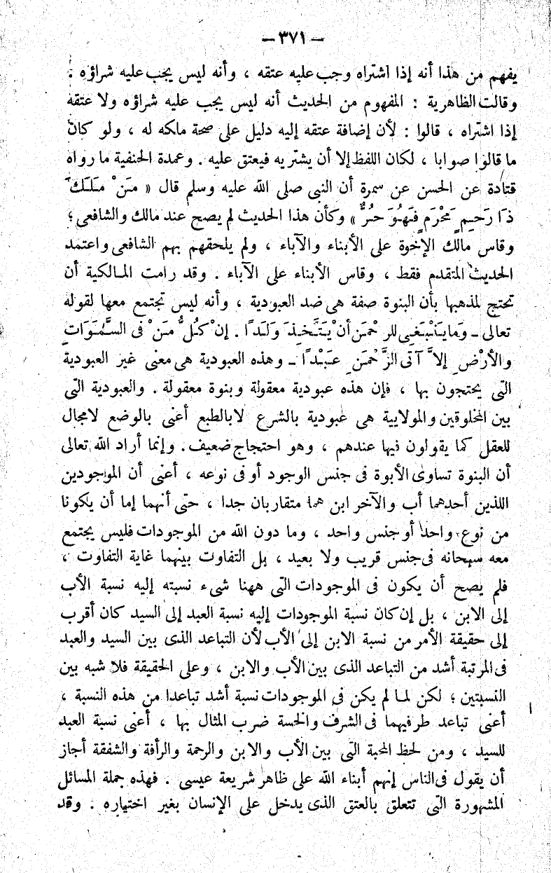 وقد رامت المالكية أن تحتج لمذهبها بأن البنوة صفة هي ضد العبودية وأنه ليس تجتمع معها لقوله تعالى: {وَمَا يَنْبَغِي لِلرَّحْمَنِ أَنْ يَتَّخِذَ وَلَداً إِنْ كُلُّ مَنْ فِي السَّمَاوَاتِ وَالأَرْضِ إِلاَّ آتِي الرَّحْمَنِ عَبْدا}ً.