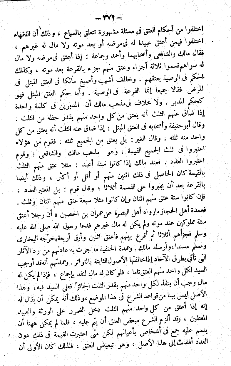 اختلفوا من أحكام العتق في مسألة مشهورة تتعلق بالسماع وذلك أن الفقهاء اختلفوا فيمن أعتق عبيدا له في مرضه أو بعد موته ولا مال له غيرهم فقال مالك والشافعي وأصحابهما وأحمد وجماعة إذا أعتق في مرضه ولا مال له سواهم قسموا ثلاثة أجزاء وعتق منهم جزء بالقرعة بعد موته وكذلك الحكم في الوصية بعتقهم.