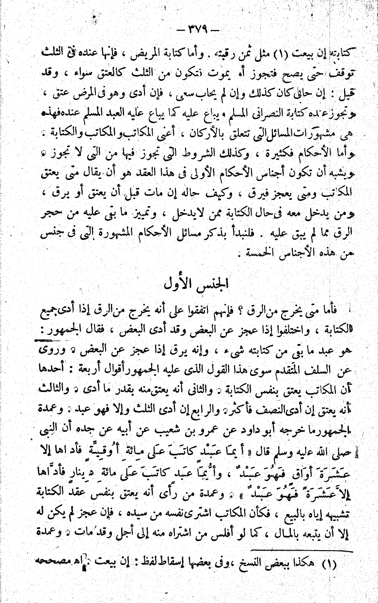 ويشبه أن تكون أجناس الأحكام الأولى في هذا العقد هو أن يقال متى يعتق المكاتب ومتى يعجز فيرق وكيف حاله إن مات قبل أن يعتق أو يرق ومن يدخل معه في حال الكتابة ممن لا يدخل وتمييز ما بقي عليه من حجر الرق مما لم يبق عليه.