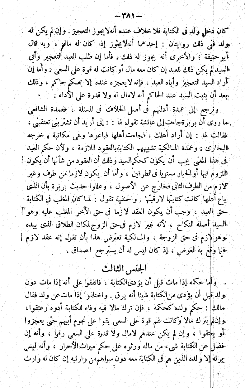 العقد لازما في حق الآخر المغلب عليه وهو السيد أصله النكاح لأنه غير لازم في حق الزوج لمكان الطلاق الذي بيده وهو لازم في حق الزوجة والمالكية تعترض على هذا بأن تقول إنه عقد لازم فيما وقع به العوض إذ كان ليس له أن يسترجع الصداق.