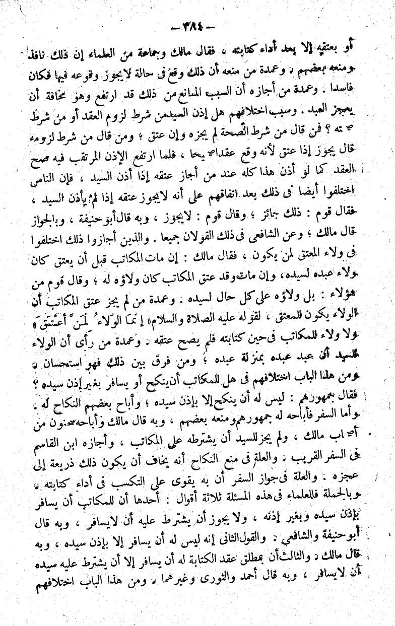 ومن هذا الباب اختلافهم في هل للمكاتب أن ينكح أو يسافر بغير إذن سيده فقال جمهورهم ليس له أن ينكح إلا بإذن سيده وأباح بعضهم النكاح له.