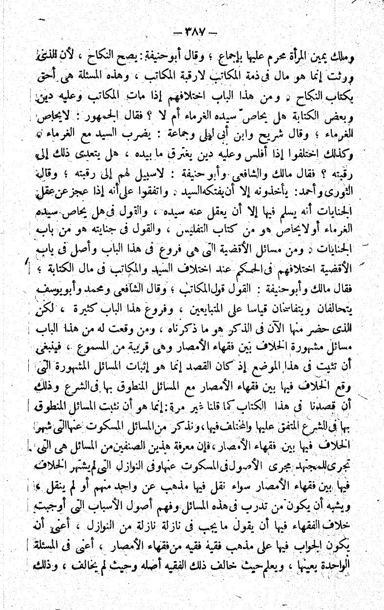ومن مسائل الأقضية التي هي فروع في هذا الباب وأصل في باب الأقضية اختلافهم في الحكم عند اختلاف السيد والمكاتب في مال الكتابة فقال مالك وأبو حنيفة القول قول المكاتب وقال الشافعي ومحمد وأبو يوسف يتحالفان ويتفاسخان قياسا على المتبايعين وفروع هذا الباب كثيرة لكن الذي حضر منها الآن في الذكر هو ما ذكرناه ومن وقعت له من هذا الباب مسائل مشهورة الخلاف بين فقهاء الأمصار وهي المساجد من المسموع فينبغي أن تثبت في هذا الموضع إذ كان القصد إنما هو إثبات المسائل المشهورة التي وقع الخلاف فيها بين فقهاء الأمصار مع المسائل المنطوق بها في الشرع وذلك أن قصدنا في هذا الكتاب كما قلنا غير مرة إنما هو أن نثبت المسائل المنطوق بها في الشرع المتفق عليها والمختلف فيها ونذكر من المسائل المسكوت عنها التي شهر الخلاف فيها بين فقهاء الأمصار فإن معرفة هذين الصنفين من المسائل هي التي تجري للمجتهد مجرى الأصول في المسكوت عنها وفي النوازل التي لم يشتهر الخلاف فيها بين فقهاء الأمصار سواء نقل فيها مذهب عن واحد منهم أو لم ينقل ويشبه أن يكون من تدرب في هذه المسائل وفهم أصول الأسباب التي أوجبت خلاف الفقهاء فيها أن يقول ما يجب في نازلة من النوازل أعني أن يكون الجواب فيها على مذهب فقيه فقيه من فقهاء الأمصار أعني في المسألة الواحدة بعينها ويعلم حيث خالف ذلك الفقيه أصله وحيث لم يخالف وذلك