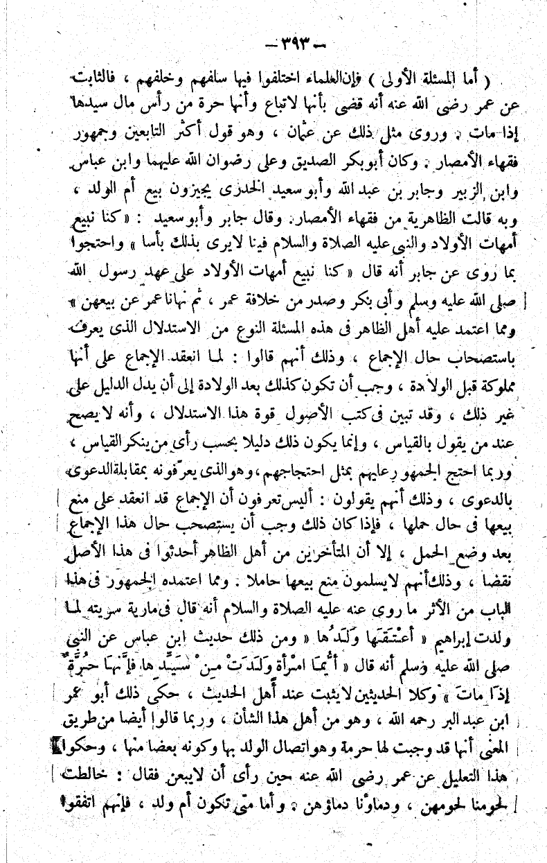 ومما اعتمده الجمهور في هذا الباب من الأثر ما روي عنه عليه الصلاة والسلام أنه قال في مارية سريته لما ولدت إبراهيم "أعتقها ولدها" ومن ذلك حديث ابن عباس عن النبي صلى الله عليه وسلم أنه قال "أيما امرأة ولدت من سيدها فإنها حرة إذا مات" وكلا الحديثين لا يثبت عند أهل الحديث حكى ذلك أبو عمر بن عبد البر رحمه الله وهو من أهل هذا الشأن وربما قالوا أيضا من طريق المعنى إنها قد وجبت لها حرمة وهو اتصال الولد بها وكونه بعضا منها وحكوا هذا التعليل عن عمر رضي الله عنه حين رأى أن لا يبعن فقال خالطت لحومنا لحومهن ودماؤنا دماءهن.