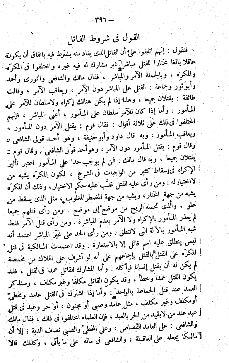 ومن رأى قتل الآمر فقط شبه المأمور بالآلة التي لا تنطق ومن رأى الحد على غير المباشر اعتمد أنه ليس ينطلق عليه اسم قاتل إلا بالاستعارة.