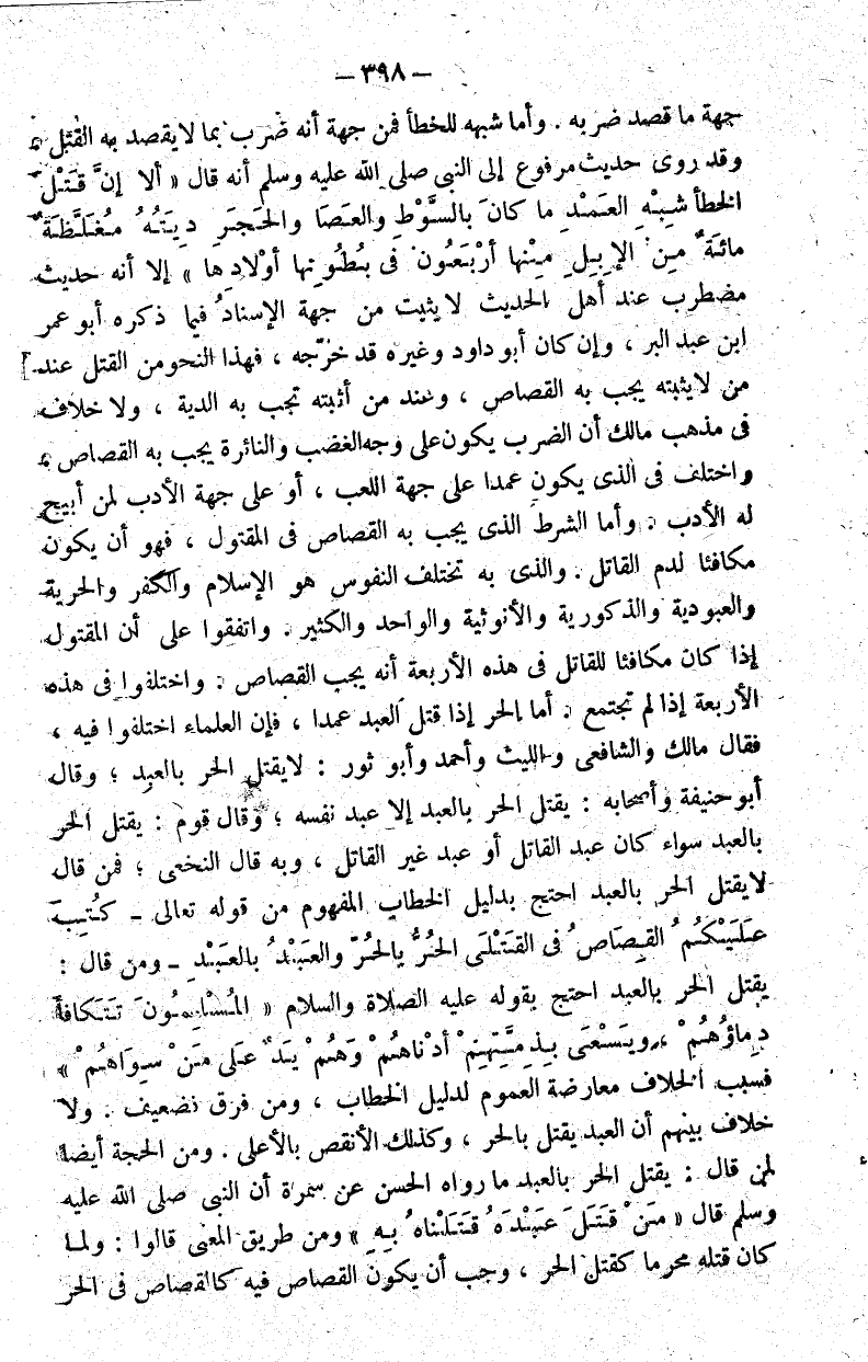 واختلفوا في هذه الأربعة إذا لم تجتمع أم الحر إذا قتل العبد عمدا فإن العلماء اختلفوا فيه فقال مالك والشافعي والليث وأحمد وأبو ثور لا يقتل الحر بالعبد وقال أبو حنيفة وأصحابه يقتل الحر بالعبد إلا عبد نفسه وقال قوم يقتل الحر بالعبد سواء أكان عبد القاتل أو عبد غير القاتل وبه قال النخعي فمن قال لا يقتل الحر بالعبد احتج بدليل الخطاب المفهوم من قوله تعالى :{كُتِبَ عَلَيْكُمُ الْقِصَاصُ فِي الْقَتْلَى الْحُرُّ بِالْحُرِّ وَالْعَبْدُ بِالْعَبْدِ} ومن قال يقتل الحر بالعبد احتج بقوله عليه الصلاة والسلام "المسلمون تتكافأ دماؤهم ويسعى بذمتهم أدناهم وهم يد على من سواهم"