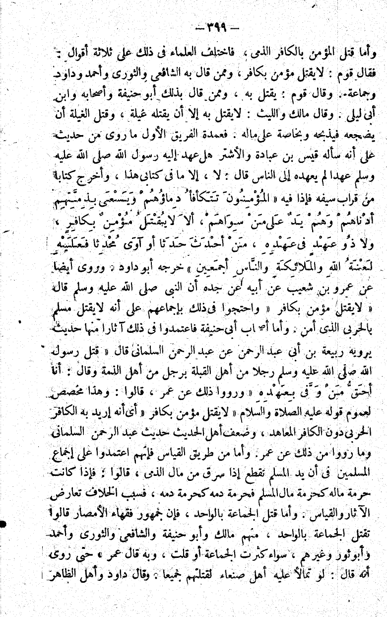 وأما قتل المؤمن بالكافر الذمي فاختلف العلماء في ذلك على ثلاثة أقوال فقال قوم لا يقتل مؤمن بكافر وممن قال به الشافعي والثوري وأحمد وداود وجماعة.