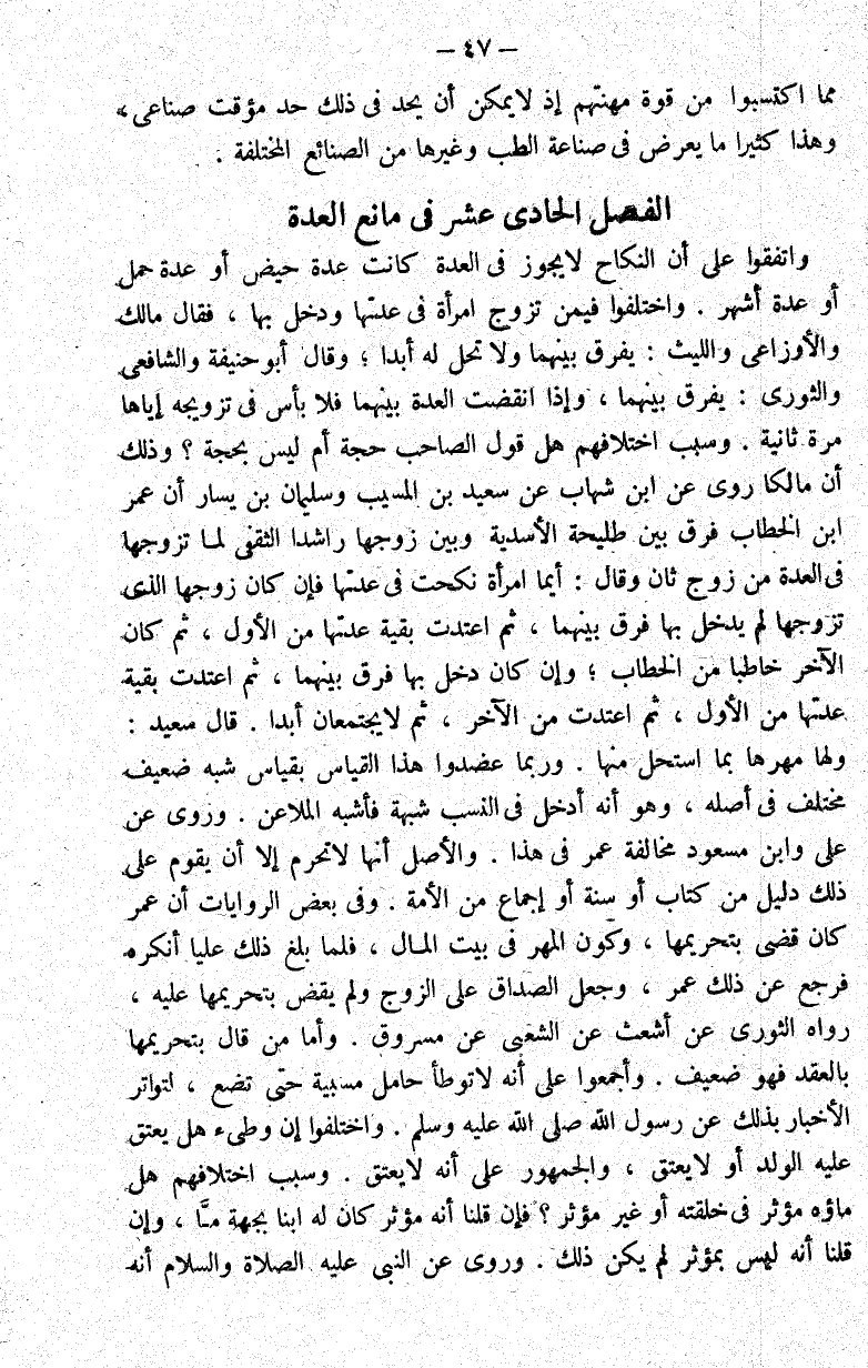 على هل قول الصاحب حجة أم ليس بحجة؟ وذلك أن مالكا روى عن ابن شهاب عن سعيد بن المسيب وسليمان بن يسار أن عمر بن الخطاب فرق بين طليحة الأسدية وبين زوجها راشدا الثقفي لما تزوجها في العدة من زوج ثان وقال: أيما امرأة نكحت في عدتها فإن كان زوجها الذي تزوجها لم يدخل بها فرق بينهما ثم اعتدت بقية عدتها من الأول ثم كان الآخر خاطبا من الخطاب وإن كان دخل بها فرق بينهما ثم اعتدت بقية عدتها من الأول ثم اعتدت من الآخر ثم لا يجتمعان أبدا قال سعيد: ولها مهرها بما استحل منها.