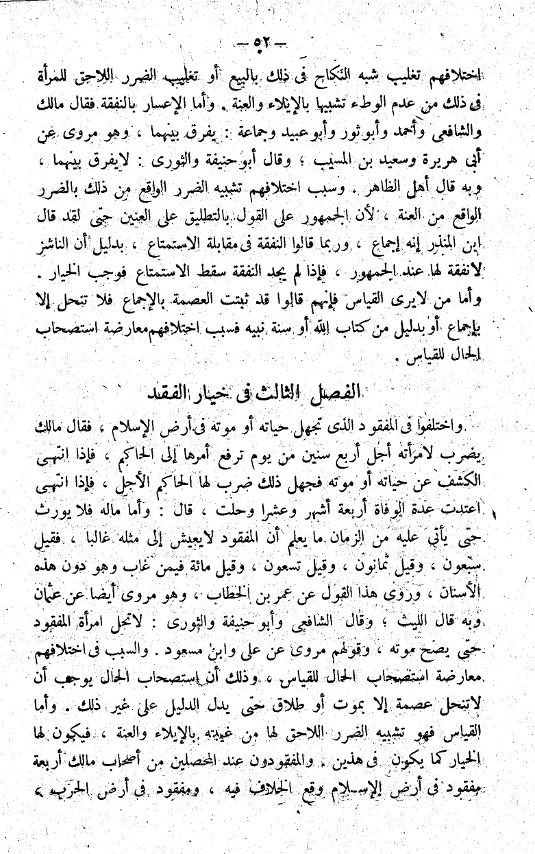 وأما القياس فهو تشبيه الضرر اللاحق لها من غيبته بالإيلاء والعنة فيكون لها الخيار كما يكون في هذين والمفقودون عند المحصلين من أصحاب مالك أربعة مفقود في أرض الإسلام وقع الخلاف فيه ومفقود في أرض الحرب