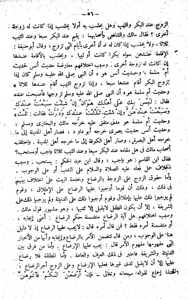 معارضة حديث أنس لحديث أم سلمة وحديث أنس هو " أن النبي صلى الله عليه وسلم كان إذا تزوج البكر أقام عندها سبعا وإذا تزوج الثيب أقام عندها ثلاثا " وحديث أم سلمة هو " أن النبي صلى الله عليه وسلم تزوجها فأصبحت عنده فقال: ليس بك على أهلك هوان إن شئت سبعت عندك وسبعت عندهن وإن شئت ثلثت عندك ودرت فقالت: ثلث " وحديث أم سلمة هو مدني متفق عليه خرجه مالك والبخاري ومسلم وحديث أنس حديث بصري خرجه أبو داود فصار أهل المدينة إلى ما خرجه أهل البصرة وصار أهل الكوفة إلى ما خرجه أهل المدينة.
