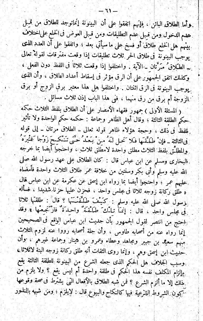 (المسألة الأولى) جمهور فقهاء الأمصار على أن الطلاق بلفظ الثلاث حكمه حكم الطلقة الثالثة وقال أهل الظاهر وجماعة: حكمه حكم الواحدة ولا تأثير للفظ في ذلك وحجة هؤلاء ظاهر قوله تعالى: { الطلاق مرتان } إلى قوله في الثالثة : {فإن طلقها فلا تحل له من بعد حتى تنكح زوجا غيره } والمطلق بلفظ الثلاث مطلق واحدة لا مطلق ثلاث واحتجوا أيضا بما خرجه البخاري ومسلم عن ابن عباس قال: كان الطلاق على عهد رسول الله صلى الله عليه وسلم وأبي بكر وسنتين من خلافة عمر طلاق الثلاث واحدة فأمضاه عليهم عمر واحتجوا أيضا بما رواه ابن إسحاق عن عكرمة عن ابن عباس قال " طلق ركانة زوجه ثلاثا في مجلس واحد فحزن عليها حزنا شديدا فسأله رسول الله صلى الله عليه وسلم: كيف طلقتها؟ قال: طلقتها ثلاثا في مجلس واحد قال: إنما تلك طلقة واحدة فارتجعها" وقد احتج من انتصر لقول الجمهور بأن حديث ابن عباس الواقع في الصحيحين إنما رواه عنه من أصحابه طاوس وأن جلة أصحابه رووا عنه لزوم الثلاث منهم سعيد بن جبير ومجاهد وعطاء وعمرو بن دينار وجماعة غيرهم وأن حديث ابن إسحاق وهم وإنما روى الثقات أنه طلق ركانة زوجه البتة لا ثلاثا.