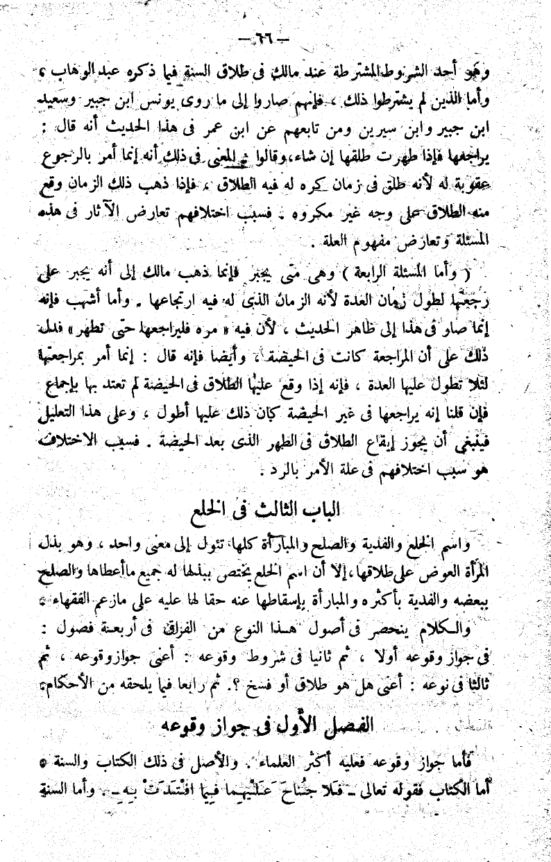 والكلام ينحصر في أصول هذا النوع من الفراق في أربعة فصول: في جواز وقوعه أولا ثم ثانيا في شروط وقوعه: أعني جواز وقوعه ثم ثالثا في نوعه: أعني هل هو طلاق أو فسخ؟ ثم رابعا فيما يلحقه من الأحكام.