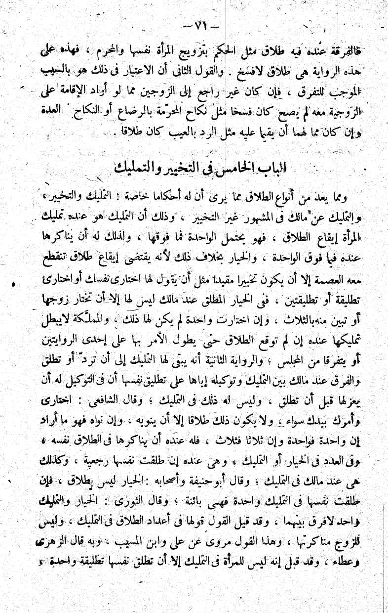 ومما يعد من أنواع الطلاق مما يرى أن له أحكاما خاصة: التمليك والتخيير والتمليك عن مالك في المشهورغير التخيير وذلك أن التمليك هو عنده تمليك المرأة إيقاع الطلاق فهو يحتمل الواحدة فما فوقها ولذلك له أن يناكرها عنده فيما فوق الواحدة والخيار بخلاف ذلك لأنه يقتضي إيقاع طلاق تنقطع معه العصمة إلا أن يكون تخييرا مقيدا مثل أن يقول لها اختاري نفسك أو اختاري تطليقة أو تطليقتين.