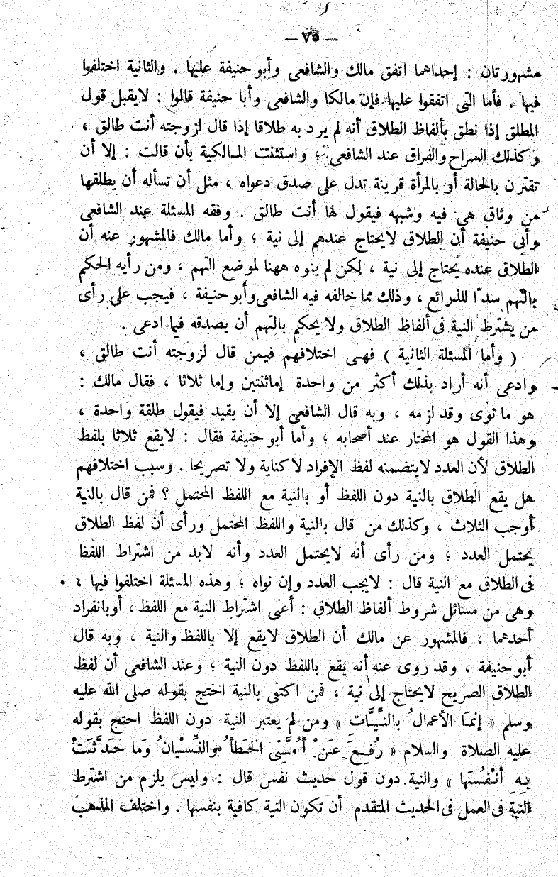 هل يقع الطلاق بالنية دون اللفظ أو بالنية مع اللفظ المحتمل؟ فمن قال بالنية أوجب الثلاث وكذلك من قال بالنية واللفظ المحتمل ورأى أن لفظ الطلاق يحتمل العدد ومن رأى أنه لا يحتمل العدد وأنه لا بد من اشتراط اللفظ في الطلاق مع النية قال: لا يجب العدد وإن نواه وهذه المسألة اختلفوا فيها وهي من مسائل شروط ألفاظ الطلاق: أعني اشتراط النية مع اللفظ أو بانفراد أحدهما فالمشهور عن مالك أن الطلاق لا يقع إلا باللفظ والنية وبه قال أبو حنيفة وقد روي عنه أنه يقع باللفظ دون النية وعند الشافعي أن لفظ الطلاق الصريح لا يحتاج إلى نية فمن اكتفى بالنية احتج بقوله صلى الله عليه وسلم " إنما الأعمال بالنيات " ومن لم يعتبر النية دون اللفظ احتج بقوله عليه الصلاة والسلام: "رفع عن أمتي الخطأ والنسيان وما حدثت به أنفسها " والنية دون قول حديث نفس.