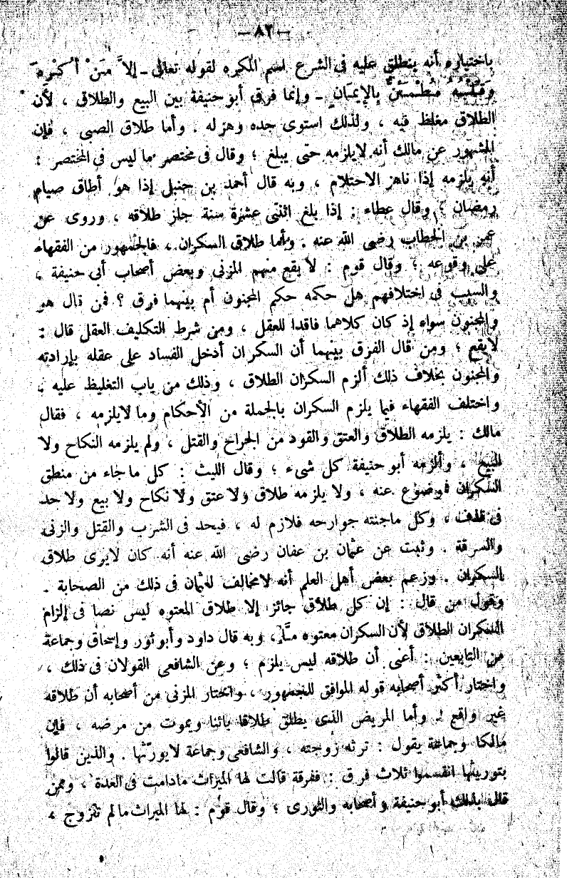 هل حكمه حكم المجنون أم بينهما فرق فمن قال هو والمجنون سواء إذ كان كلاهما فاقدا للعقل ومن شرط التكليف العقل قال لا يقع ومن قال الفرق بينهما أن السكران أدخل الفساد على عقله بإرادته والمجنون بخلاف ذلك ألزم السكران الطلاق وذلك من باب التغليظ عليه واختلف الفقهاء فيما يلزم السكران بالجملة من الأحكام وما لا يلزمه فقال مالك يلزمه الطلاق والعتق.والقود من الجراح والقتل ولم يلزمه النكاح ولا البيع وألزمه أبو حنيفة كل شيء وقال الليث كل ما جاء من منطق السكران فموضوع عنه ولا يلزمه طلاق ولا عتق ولا نكاح ولا بيع ولا حد في قذف وكل ما جنته جوارحه فلازم له فيحد في الشرب والقتل والزنا والسرقة وثبت عن عثمان بن عفان رضي الله عنه أنه كان لا يرى طلاق السكران وزعم بعض أهل العلم أنه لا مخالف لعثمان في ذلك من الصحابة.