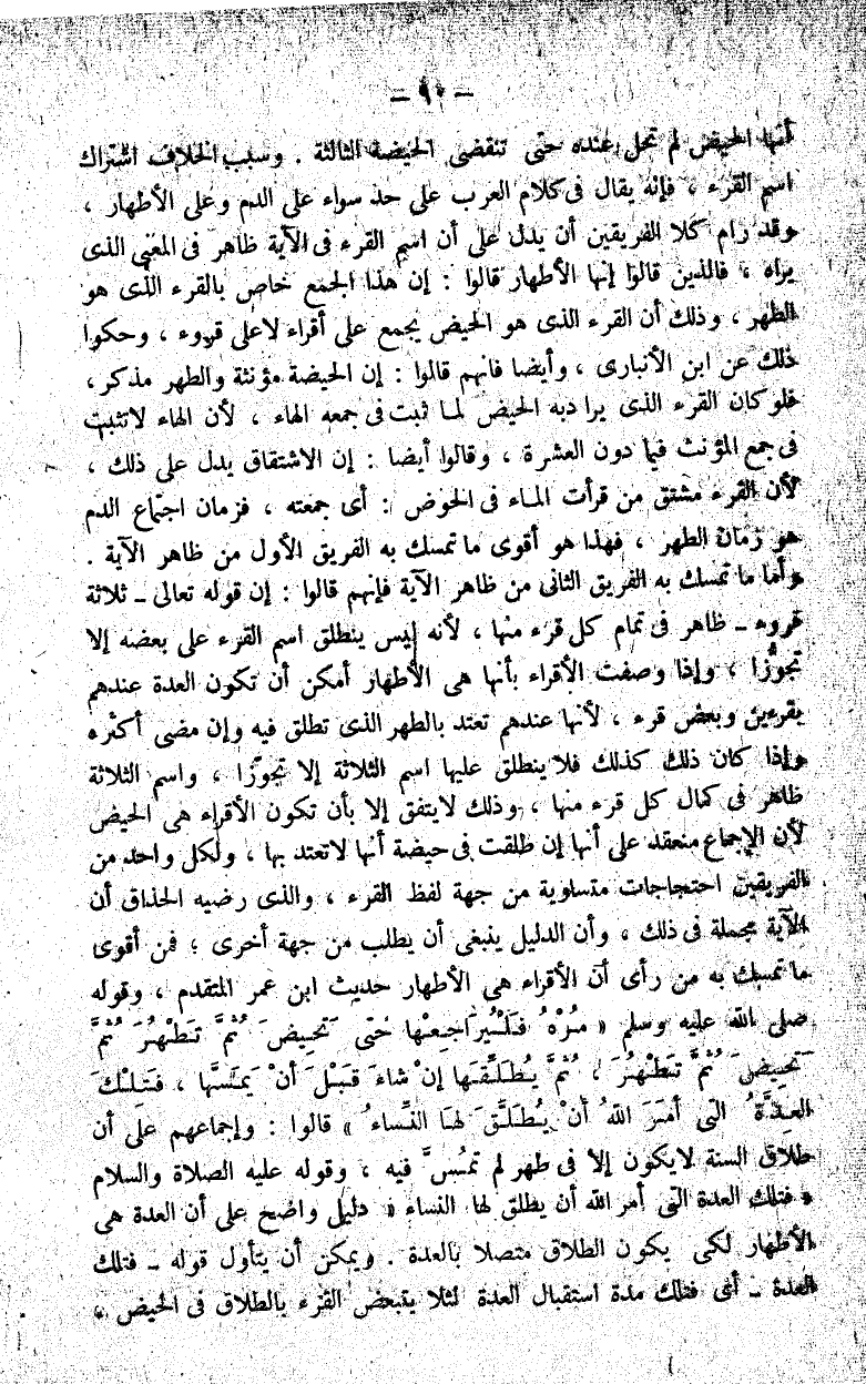 وأن الدليل ينبغي أن يطلب من جهة أخرى فمن أقوى ما تمسك به من رأى أن الأقراء هي الأطهار حديث ابن عمر المتقدم وقوله صلى الله عليه وسلم: "مره فليراجعها حتى تحيض ثم تطهر ثم تحيض ثم تطهر ثم يطلقها إن شاء قبل أن يمسها فتلك العدة التي أمر الله أن يطلق لها النساء" قالوا وإجماعهم على أن طلاق السنة لا يكون إلا في طهر لم تمس فيه وقوله عليه الصلاة والسلام: "فتلك العدة التي أمر الله أن يطلق لها النساء" دليل واضح على أن العدة هي الأطهار لكي يكون الطلاق متصلا بالعدة.