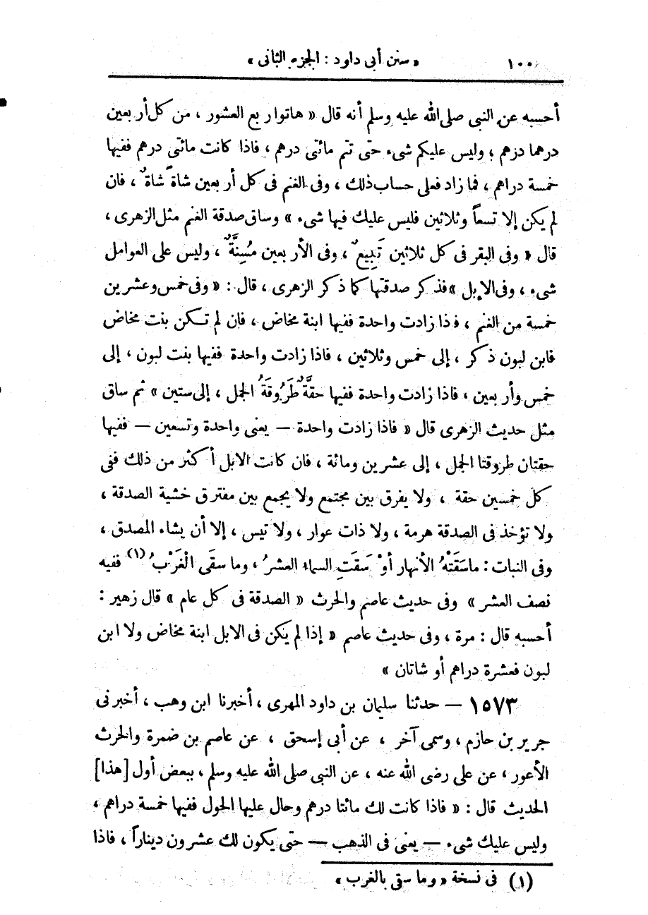 1573 - حَدَّثَنَا سُلَيْمَانُ بْنُ دَاوُدَ الْمَهْرِيُّ، أَخْبَرَنَا ابْنُ وَهْبٍ، أَخْبَرَنِي جَرِيرُ بْنُ حَازِمٍ، وَسَمَّى آخَرَ، عَنْ أَبِي إِسْحَاقَ، عَنْ عَاصِمِ بْنِ ضَمْرَةَ، وَالْحَارِثِ الْأَعْوَرِ، عَنْ عَلِيٍّ رَضِيَ اللَّهُ عَنْهُ، عَنِ النَّبِيِّ صَلَّى اللهُ عَلَيْهِ وَسَلَّمَ بِبَعْضِ أَوَّلِ هَذَا الْحَدِيثِ، قَالَ: «فَإِذَا كَانَتْ لَكَ مِائَتَا دِرْهَمٍ، وَحَالَ عَلَيْهَا الْحَوْلُ، فَفِيهَا خَمْسَةُ دَرَاهِمَ، وَلَيْسَ عَلَيْكَ شَيْءٌ - يَعْنِي - فِي الذَّهَبِ حَتَّى يَكُونَ لَكَ عِشْرُونَ دِينَارًا، فَإِذَا -[101]- كَانَ لَكَ عِشْرُونَ دِينَارًا، وَحَالَ عَلَيْهَا الْحَوْلُ، فَفِيهَا نِصْفُ دِينَارٍ، فَمَا زَادَ، فَبِحِسَابِ ذَلِكَ»، قَالَ: فَلَا أَدْرِي أَعَلِيٌّ يَقُولُ: فَبِحِسَابِ ذَلِكَ، أَوْ رَفَعَهُ إِلَى النَّبِيِّ صَلَّى اللهُ عَلَيْهِ وَسَلَّمَ، وَلَيْسَ فِي مَالٍ زَكَاةٌ حَتَّى يَحُولَ عَلَيْهِ الْحَوْلُ، إِلَّا أَنَّ جَرِيرًا، قَالَ ابْنُ وَهْبٍ «يَزِيدُ فِي الْحَدِيثِ عَنِ النَّبِيِّ صَلَّى اللهُ عَلَيْهِ وَسَلَّمَ، لَيْسَ فِي مَالٍ زَكَاةٌ حَتَّى يَحُولَ عَلَيْهِ الْحَوْلُ»