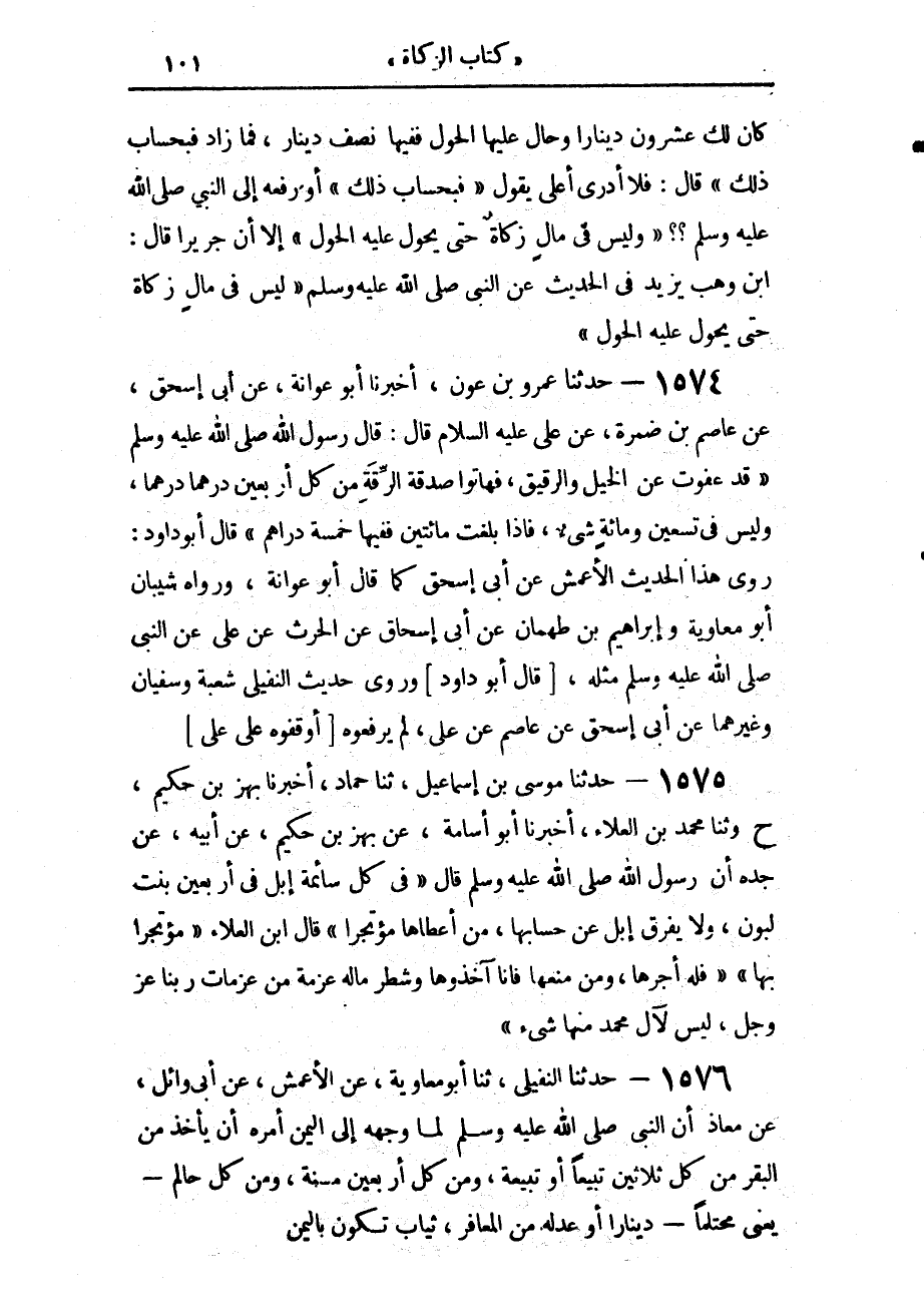 1574 - حَدَّثَنَا عَمْرُو بْنُ عَوْنٍ، أَخْبَرَنَا أَبُو عَوَانَةَ، عَنْ أَبِي إِسْحَاقَ، عَنْ عَاصِمِ بْنِ ضَمْرَةَ، عَنْ عَلِيٍّ عَلَيْهِ السَّلَام، قَالَ: قَالَ رَسُولُ اللَّهِ صَلَّى اللهُ عَلَيْهِ وَسَلَّمَ: «§قَدْ عَفَوْتُ عَنِ الْخَيْلِ وَالرَّقِيقِ، فَهَاتُوا صَدَقَةَ الرِّقَةِ، مِنْ كُلِّ أَرْبَعِينَ دِرْهَمًا دِرْهَمًا، وَلَيْسَ فِي تِسْعِينَ وَمِائَةٍ شَيْءٌ، فَإِذَا بَلَغَتْ مِائَتَيْنِ، فَفِيهَا خَمْسَةُ دَرَاهِمَ»، قَالَ أَبُو دَاوُدَ: رَوَى هَذَا الْحَدِيثَ الْأَعْمَشُ، عَنْ أَبِي إِسْحَاقَ، كَمَا قَالَ أَبُو عَوَانَةَ، وَرَوَاهُ شَيْبَانُ أَبُو مُعَاوِيَةَ، وَإِبْرَاهِيمُ بْنُ طَهْمَانَ، عَنْ أَبِي إِسْحَاقَ، عَنِ الْحَارِثِ، عَنْ عَلِيٍّ، عَنِ النَّبِيِّ صَلَّى اللهُ عَلَيْهِ وَسَلَّمَ مِثْلَهُ، قَالَ أَبُو دَاوُدَ: وَرَوَى حَدِيثَ النُّفَيْلِيِّ، شُعْبَةُ، وَسُفْيَانُ وَغَيْرُهُمَا عَنْ أَبِي إِسْحَاقَ، عَنْ عَاصِمٍ، عَنْ عَلِيٍّ لَمْ يَرْفَعُوهُ، أَوْقَفُوهُ عَلَى عَلِيٍّ