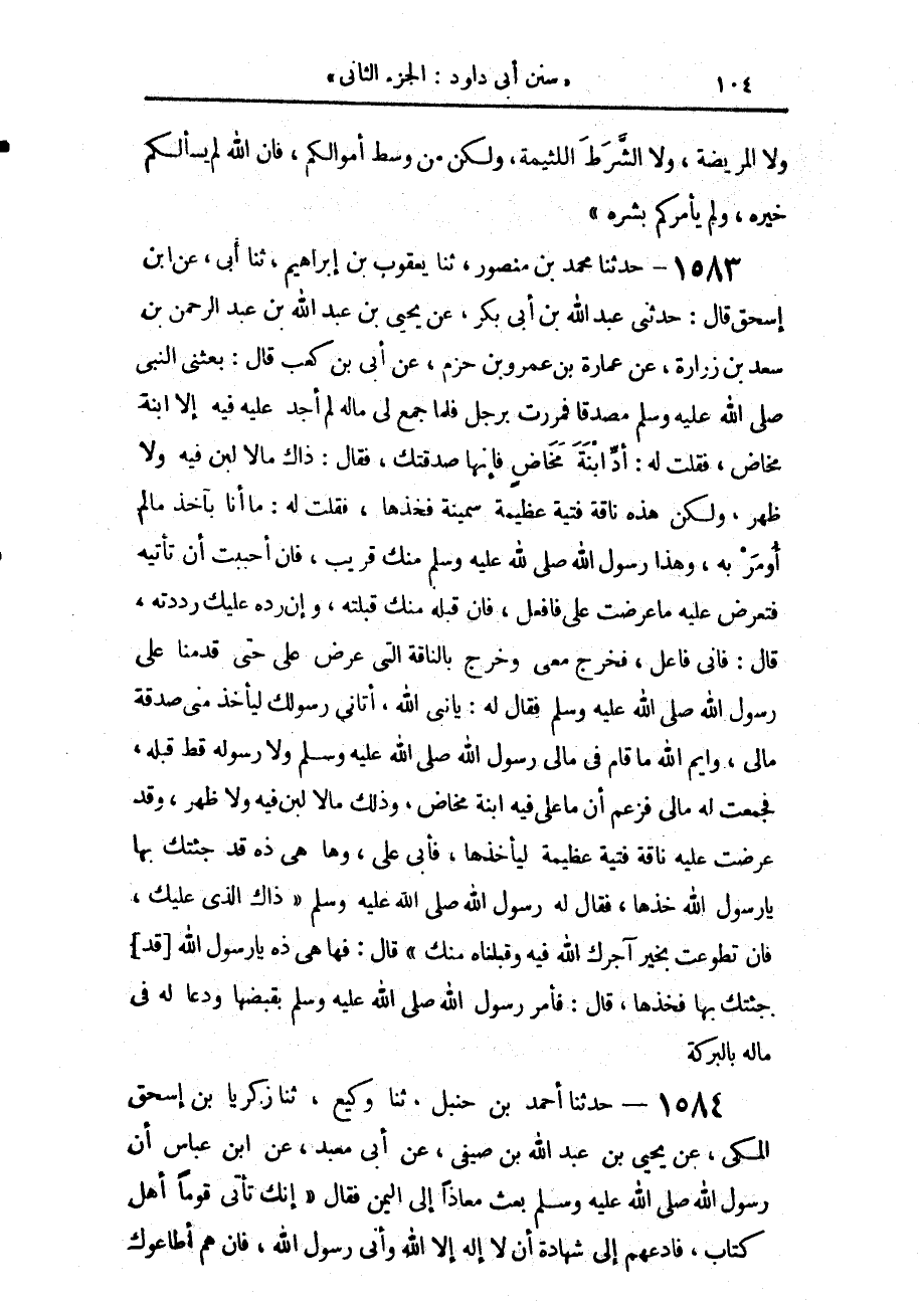1583 - حَدَّثَنَا مُحَمَّدُ بْنُ مَنْصُورٍ، حَدَّثَنَا يَعْقُوبُ بْنُ إِبْرَاهِيمَ، حَدَّثَنَا أَبِي، عَنِ ابْنِ إِسْحَاقَ، قَالَ: حَدَّثَنِي عَبْدُ اللَّهِ بْنُ أَبِي بَكْرٍ، عَنْ يَحْيَى بْنِ عَبْدِ اللَّهِ بْنِ عَبْدِ الرَّحْمَنِ بْنِ سَعْدِ بْنِ زُرَارَةَ، عَنْ عُمَارَةَ بْنِ عَمْرِو بْنِ حَزْمٍ، عَنْ أُبَيِّ بْنِ كَعْبٍ، قَالَ: بَعَثَنِي النَّبِيُّ صَلَّى اللهُ عَلَيْهِ وَسَلَّمَ مُصَدِّقًا، فَمَرَرْتُ بِرَجُلٍ، فَلَمَّا جَمَعَ لِي مَالَهُ لَمْ أَجِدْ عَلَيْهِ فِيهِ إِلَّا ابْنَةَ مَخَاضٍ، فَقُلْتُ لَهُ: أَدِّ ابْنَةَ مَخَاضٍ، فَإِنَّهَا صَدَقَتُكَ، فَقَالَ: ذَاكَ مَا لَا لَبَنَ فِيهِ، وَلَا ظَهْرَ، وَلَكِنْ هَذِهِ نَاقَةٌ فَتِيَّةٌ عَظِيمَةٌ سَمِينَةٌ، فَخُذْهَا، فَقُلْتُ لَهُ: مَا أَنَا بِآخِذٍ مَا لَمْ أُومَرْ بِهِ، وَهَذَا رَسُولُ اللَّهِ صَلَّى اللهُ عَلَيْهِ وَسَلَّمَ مِنْكَ قَرِيبٌ، فَإِنْ أَحْبَبْتَ أَنْ تَأْتِيَهُ، فَتَعْرِضَ عَلَيْهِ مَا عَرَضْتَ عَلَيَّ فَافْعَلْ، فَإِنْ قَبِلَهُ مِنْكَ قَبِلْتُهُ، وَإِنْ رَدَّهُ عَلَيْكَ رَدَدْتُهُ، قَالَ: فَإِنِّي فَاعِلٌ، فَخَرَجَ مَعِي وَخَرَجَ بِالنَّاقَةِ الَّتِي عَرَضَ عَلَيَّ حَتَّى قَدِمْنَا عَلَى رَسُولِ اللَّهِ صَلَّى اللهُ عَلَيْهِ وَسَلَّمَ، فَقَالَ لَهُ: يَا نَبِيَّ اللَّهِ، أَتَانِي رَسُولُكَ لِيَأْخُذَ مِنِّي صَدَقَةَ مَالِي، وَايْمُ اللَّهِ مَا قَامَ فِي مَالِي رَسُولُ اللَّهِ صَلَّى اللهُ عَلَيْهِ وَسَلَّمَ، وَلَا رَسُولُهُ قَطُّ قَبْلَهُ، فَجَمَعْتُ لَهُ مَالِي، فَزَعَمَ أَنَّ مَا عَلَيَّ فِيهِ ابْنَةُ مَخَاضٍ، وَذَلِكَ مَا لَا لَبَنَ فِيهِ، وَلَا ظَهْرَ، وَقَدْ عَرَضْتُ عَلَيْهِ نَاقَةً فَتِيَّةً عَظِيمَةً لِيَأْخُذَهَا فَأَبَى عَلَيَّ، وَهَا هِيَ ذِهْ قَدْ جِئْتُكَ بِهَا يَا رَسُولَ اللَّهِ خُذْهَا، فَقَالَ لَهُ رَسُولُ اللَّهِ صَلَّى اللهُ عَلَيْهِ وَسَلَّمَ: «§ذَاكَ الَّذِي عَلَيْكَ، فَإِنْ تَطَوَّعْتَ بِخَيْرٍ آجَرَكَ اللَّهُ فِيهِ، وَقَبِلْنَاهُ مِنْكَ»، قَالَ: فَهَا هِيَ ذِهْ يَا رَسُولَ اللَّهِ، قَدْ جِئْتُكَ بِهَا فَخُذْهَا، قَالَ: فَأَمَرَ رَسُولُ اللَّهِ صَلَّى اللهُ عَلَيْهِ وَسَلَّمَ بِقَبْضِهَا، وَدَعَا لَهُ فِي مَالِهِ بِالْبَرَكَةِ