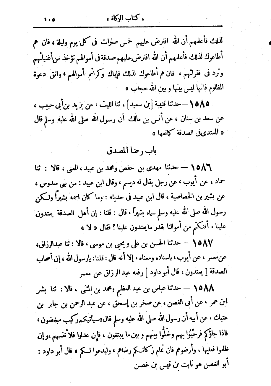 1586 - حَدَّثَنَا مَهْدِيُّ بْنُ حَفْصٍ، وَمُحَمَّدُ بْنُ عُبَيْدٍ، الْمَعْنَى، قَالَا: حَدَّثَنَا حَمَّادٌ، عَنْ أَيُّوبَ، عَنْ رَجُلٍ، يُقَالُ لَهُ: دَيْسَمٌ، وَقَالَ ابْنُ عُبَيْدٍ مِنْ بَنِي سَدُوسٍ، عَنْ بَشِيرِ ابْنِ الْخَصَاصِيَّةِ، - قَالَ ابْنُ عُبَيْدٍ فِي حَدِيثِهِ: وَمَا كَانَ اسْمُهُ بَشِيرًا، وَلَكِنَّ رَسُولَ اللَّهِ صَلَّى اللهُ عَلَيْهِ وَسَلَّمَ سَمَّاهُ بَشِيرًا -، قَالَ: قُلْنَا: إِنَّ §أَهْلَ الصَّدَقَةِ يَعْتَدُونَ عَلَيْنَا، أَفَنَكْتُمُ مِنْ أَمْوَالِنَا بِقَدْرِ مَا يَعْتَدُونَ عَلَيْنَا؟ فَقَالَ «لَا»،