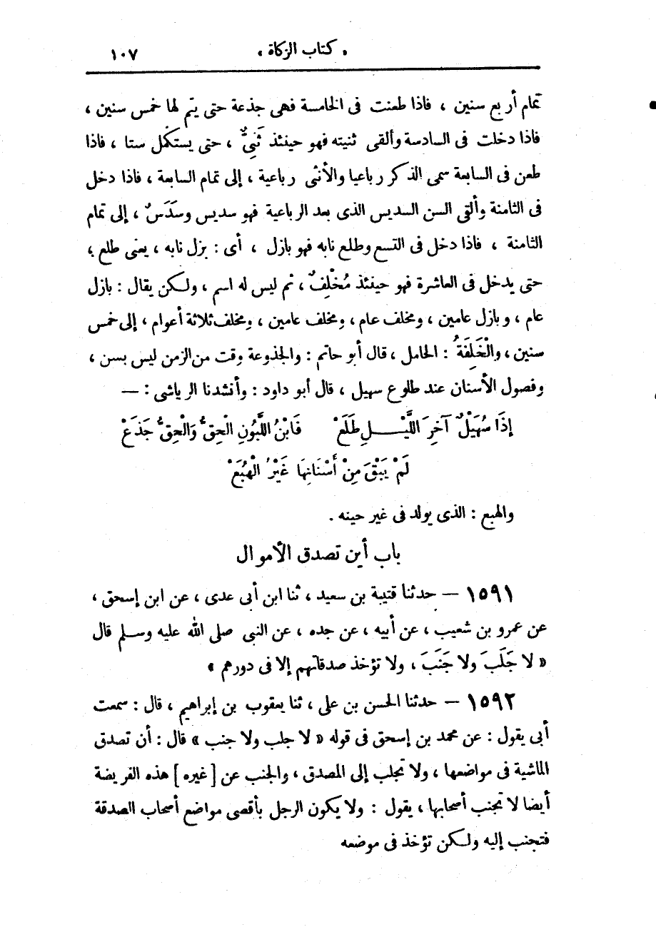 تَمَامِ أَرْبَعِ سِنِينَ، فَإِذَا طَعَنَتْ فِي الْخَامِسَةِ، فَهِيَ جَذَعَةٌ حَتَّى يَتِمَّ لَهَا خَمْسُ سِنِينَ، فَإِذَا دَخَلَتْ فِي السَّادِسَةِ، وَأَلْقَى ثَنِيَّتَهُ، فَهُوَ حِينَئِذٍ ثَنِيٌّ حَتَّى يَسْتَكْمِلَ سِتًّا، فَإِذَا طَعَنَ فِي السَّابِعَةِ سُمِّيَ الذَّكَرُ رَبَاعِيًا، وَالْأُنْثَى رَبَاعِيَةً إِلَى تَمَامِ السَّابِعَةِ، فَإِذَا دَخَلَ فِي الثَّامِنَةِ، وَأَلْقَى السِّنَّ السَّدِيسَ الَّذِي بَعْدَ الرَّبَاعِيَةِ، فَهُوَ سَدِيسٌ وَسَدَسٌ إِلَى تَمَامِ الثَّامِنَةِ، فَإِذَا دَخَلَ فِي التِّسْعِ وَطَلَعَ نَابُهُ، فَهُوَ بَازِلٌ، أَيْ بَزَلَ نَابُهُ - يَعْنِي طَلَعَ - حَتَّى يَدْخُلَ فِي الْعَاشِرَةِ، فَهُوَ حِينَئِذٍ مُخْلِفٌ، ثُمَّ لَيْسَ لَهُ اسْمٌ، وَلَكِنْ يُقَالُ: بَازِلُ عَامٍ، وَبَازِلُ عَامَيْنِ، وَمُخْلِفُ عَامٍ، وَمُخْلِفُ عَامَيْنِ، وَمُخْلِفُ ثَلَاثَةِ أَعْوَامٍ إِلَى خَمْسِ سِنِينَ، وَالْخَلِفَةُ: الْحَامِلُ قَالَ أَبُو حَاتِمٍ: " وَالْجَذُوعَةُ: وَقْتٌ مِنَ الزَّمَنِ لَيْسَ بِسِنٍّ، وَفُصُولُ الْأَسْنَانِ عِنْدَ طُلُوعِ سُهَيْلٍ "، قَالَ أَبُو دَاوُدَ: وَأَنْشَدَنَا الرِّيَاشِيُّ