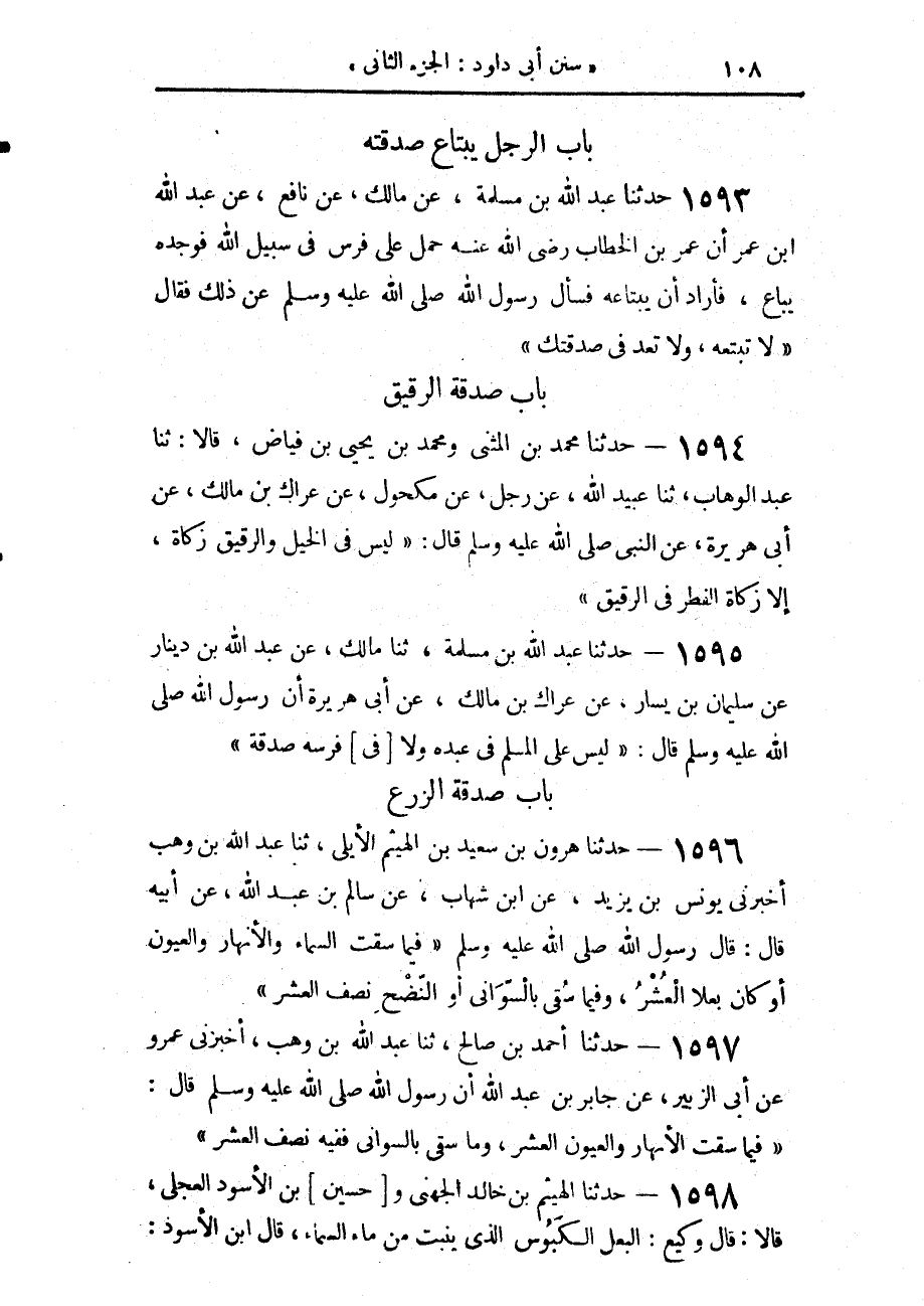 1596 - حَدَّثَنَا هَارُونُ بْنُ سَعِيدِ بْنِ الْهَيْثَمِ الْأَيْلِيُّ، حَدَّثَنَا عَبْدُ اللَّهِ بْنُ وَهْبٍ، أَخْبَرَنِي يُونُسُ بْنُ يَزِيدَ، عَنِ ابْنِ شِهَابٍ، عَنْ سَالِمِ بْنِ عَبْدِ اللَّهِ، عَنْ أَبِيهِ، قَالَ: قَالَ رَسُولُ اللَّهِ صَلَّى اللهُ عَلَيْهِ وَسَلَّمَ: «§فِيمَا سَقَتِ السَّمَاءُ وَالْأَنْهَارُ وَالْعُيُونُ، أَوْ كَانَ بَعْلًا الْعُشْرُ، وَفِيمَا سُقِيَ بِالسَّوَانِي، أَوِ النَّضْحِ نِصْفُ الْعُشْرِ»