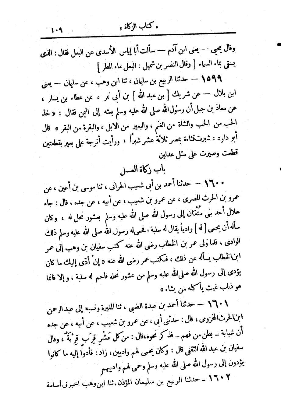 1600 - حَدَّثَنَا أَحْمَدُ بْنُ أَبِي شُعَيْبٍ الْحَرَّانِيُّ، حَدَّثَنَا مُوسَى بْنُ أَعْيَنَ، عَنْ عَمْرِو بْنِ الْحَارِثِ الْمِصْرِيِّ، عَنْ عَمْرِو بْنِ شُعَيْبٍ، عَنْ أَبِيهِ، عَنْ جَدِّهِ، قَالَ: جَاءَ هِلَالٌ أَحَدُ بَنِي مُتْعَانَ إِلَى رَسُولِ اللَّهِ صَلَّى اللهُ عَلَيْهِ وَسَلَّمَ بِعُشُورِ نَحْلٍ لَهُ، وَكَانَ سَأَلَهُ أَنْ يَحْمِيَ لَهُ وَادِيًا، يُقَالُ لَهُ: سَلَبَةُ، فَحَمَى لَهُ رَسُولُ اللَّهِ صَلَّى اللهُ عَلَيْهِ وَسَلَّمَ ذَلِكَ الْوَادِي، فَلَمَّا وُلِّيَ عُمَرُ بْنُ الْخَطَّابِ رَضِيَ اللَّهُ عَنْهُ كَتَبَ سُفْيَانُ بْنُ وَهْبٍ، إِلَى عُمَرَ بْنِ الْخَطَّابِ يَسْأَلُهُ عَنْ ذَلِكَ، فَكَتَبَ عُمَرُ رَضِيَ اللَّهُ عَنْهُ: «إِنْ §أَدَّى إِلَيْكَ مَا كَانَ يُؤَدِّي إِلَى رَسُولِ اللَّهِ صَلَّى اللهُ عَلَيْهِ وَسَلَّمَ مِنْ عُشُورِ نَحْلِهِ، فَاحْمِ لَهُ سَلَبَةَ، وَإِلَّا، فَإِنَّمَا هُوَ ذُبَابُ غَيْثٍ يَأْكُلُهُ مَنْ يَشَاءُ»،