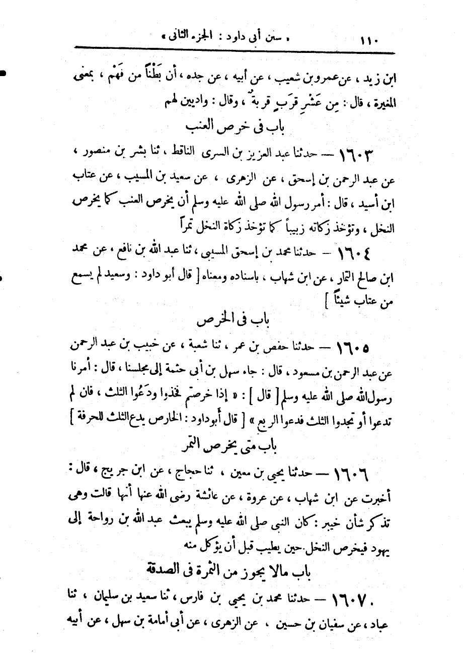 1605 - حَدَّثَنَا حَفْصُ بْنُ عُمَرَ، حَدَّثَنَا شُعْبَةُ، عَنْ خُبَيْبِ بْنِ عَبْدِ الرَّحْمَنِ، عَنْ عَبْدِ الرَّحْمَنِ بْنِ مَسْعُودٍ، قَالَ: جَاءَ سَهْلُ بْنُ أَبِي حَثْمَةَ، إِلَى مَجْلِسِنَا، قَالَ: أَمَرَنَا رَسُولُ اللَّهِ صَلَّى اللهُ عَلَيْهِ وَسَلَّمَ قَالَ: «§إِذَا خَرَصْتُمْ، فَجُذُّوا، وَدَعُوا الثُّلُثَ، فَإِنْ لَمْ تَدَعُوا، أَوْ تَجُذُّوا الثُّلُثَ، فَدَعُوا الرُّبْعَ»، قَالَ أَبُو دَاوُدَ: «الْخَارِصُ يَدَعُ الثُّلُثَ لِلْحِرْفَةِ»
