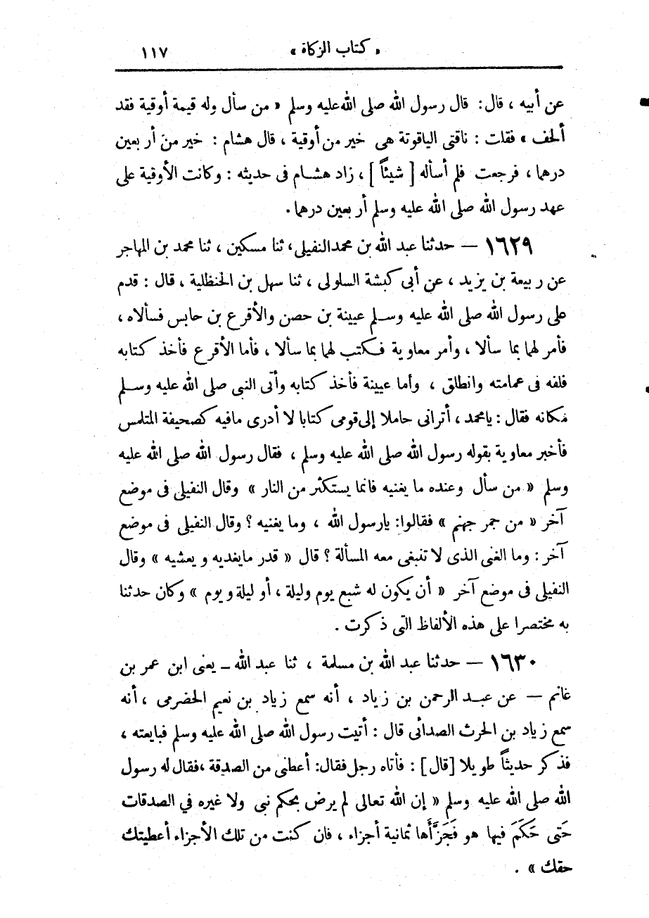 1629 - حَدَّثَنَا عَبْدُ اللَّهِ بْنُ مُحَمَّدٍ النُّفَيْلِيُّ، حَدَّثَنَا مِسْكِينٌ، حَدَّثَنَا مُحَمَّدُ بْنُ الْمُهَاجِرِ، عَنْ رَبِيعَةَ بْنِ يَزِيدَ، عَنْ أَبِي كَبْشَةَ السَّلُولِيِّ، حَدَّثَنَا سَهْلُ ابْنُ الْحَنْظَلِيَّةِ، قَالَ: قَدِمَ عَلَى رَسُولِ اللَّهِ صَلَّى اللهُ عَلَيْهِ وَسَلَّمَ عُيَيْنَةُ بْنُ حِصْنٍ، وَالْأَقْرَعُ بْنُ حَابِسٍ، فَسَأَلَاهُ، فَأَمَرَ لَهُمَا بِمَا سَأَلَا، وَأَمَرَ مُعَاوِيَةَ فَكَتَبَ لَهُمَا بِمَا سَأَلَا، فَأَمَّا الْأَقْرَعُ، فَأَخَذَ كِتَابَهُ، فَلَفَّهُ فِي عِمَامَتِهِ وَانْطَلَقَ، وَأَمَّا عُيَيْنَةُ فَأَخَذَ كِتَابَهُ، وَأَتَى النَّبِيَّ صَلَّى اللهُ عَلَيْهِ وَسَلَّمَ مَكَانَهُ، فَقَالَ: يَا مُحَمَّدُ، أَتُرَانِي حَامِلًا إِلَى قَوْمِي كِتَابًا لَا أَدْرِي مَا فِيهِ، كَصَحِيفَةِ الْمُتَلَمِّسِ، فَأَخْبَرَ مُعَاوِيَةُ بِقَوْلِهِ رَسُولَ اللَّهِ صَلَّى اللهُ عَلَيْهِ وَسَلَّمَ، فَقَالَ رَسُولُ اللَّهِ صَلَّى اللهُ عَلَيْهِ وَسَلَّمَ: «§مَنْ سَأَلَ وَعِنْدَهُ مَا يُغْنِيهِ، فَإِنَّمَا يَسْتَكْثِرُ مِنَ النَّارِ» - وَقَالَ النُّفَيْلِيُّ فِي مَوْضِعٍ آخَرَ: مِنْ جَمْرِ جَهَنَّمَ - فَقَالُوا: يَا رَسُولَ اللَّهِ، وَمَا يُغْنِيهِ؟ - وَقَالَ النُّفَيْلِيُّ فِي مَوْضِعٍ آخَرَ: وَمَا الْغِنَى الَّذِي لَا تَنْبَغِي مَعَهُ الْمَسْأَلَةُ؟ - قَالَ: «قَدْرُ مَا يُغَدِّيهِ وَيُعَشِّيهِ» وَقَالَ النُّفَيْلِيُّ فِي مَوْضِعٍ آخَرَ: «أَنْ يَكُونَ لَهُ شِبْعُ يَوْمٍ وَلَيْلَةٍ، أَوْ لَيْلَةٍ وَيَوْمٍ»، وَكَانَ حَدَّثَنَا بِهِ مُخْتَصَرًا عَلَى هَذِهِ الْأَلْفَاظِ الَّتِي ذَكَرْتُ