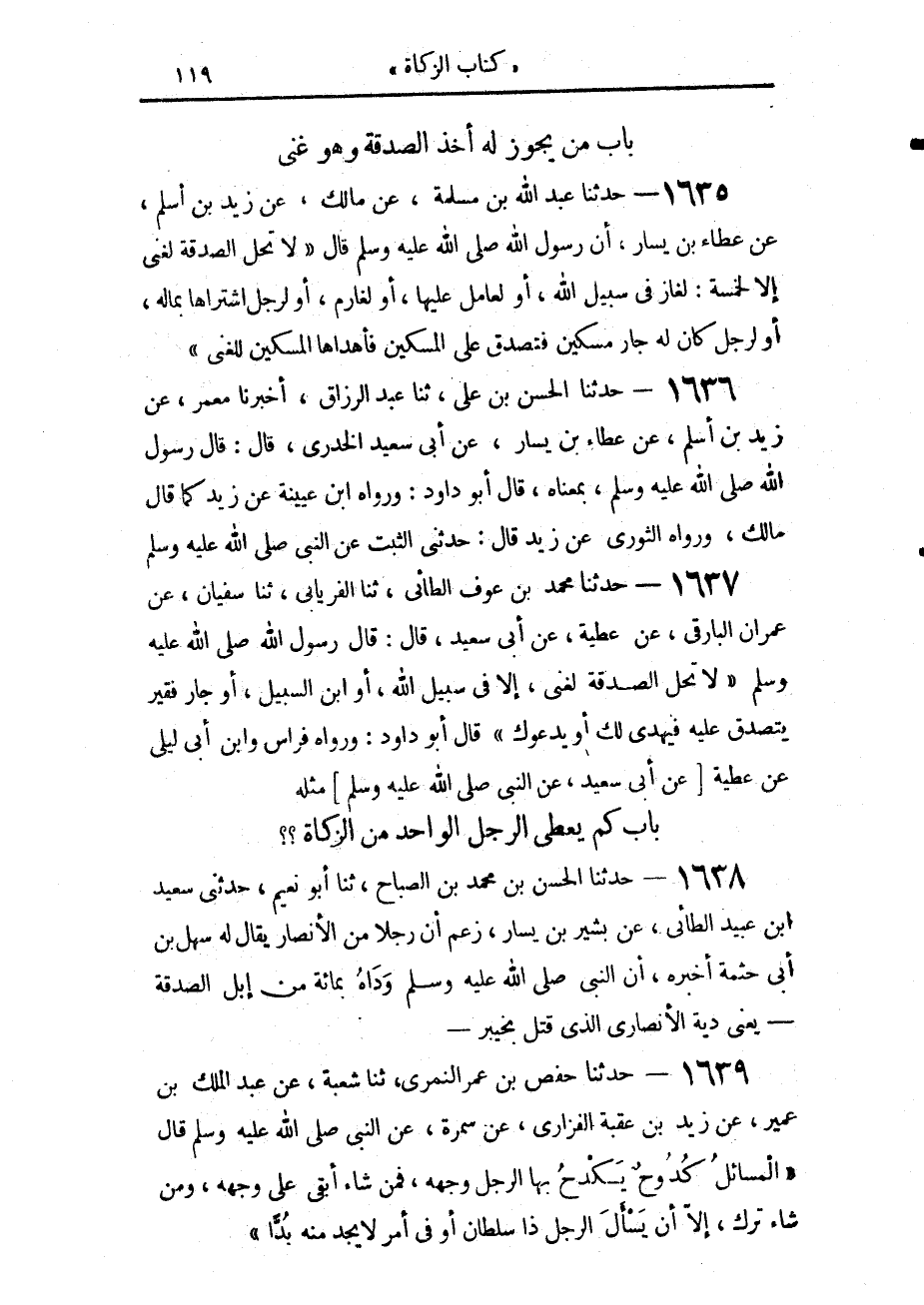 1635 - حَدَّثَنَا عَبْدُ اللَّهِ بْنُ مَسْلَمَةَ، عَنْ مَالِكٍ، عَنْ زَيْدِ بْنِ أَسْلَمَ، عَنْ عَطَاءِ بْنِ يَسَارٍ، أَنَّ رَسُولَ اللَّهِ صَلَّى اللهُ عَلَيْهِ وَسَلَّمَ قَالَ: " §لَا تَحِلُّ الصَّدَقَةُ لِغَنِيٍّ إِلَّا لِخَمْسَةٍ: لِغَازٍ فِي سَبِيلِ اللَّهِ، أَوْ لِعَامِلٍ عَلَيْهَا، أَوْ لِغَارِمٍ، أَوْ لِرَجُلٍ اشْتَرَاهَا بِمَالِهِ، أَوْ لِرَجُلٍ كَانَ لَهُ جَارٌ مِسْكِينٌ فَتُصُدِّقَ عَلَى الْمِسْكِينِ، فَأَهْدَاهَا الْمِسْكِينُ لِلْغَنِيِّ "،