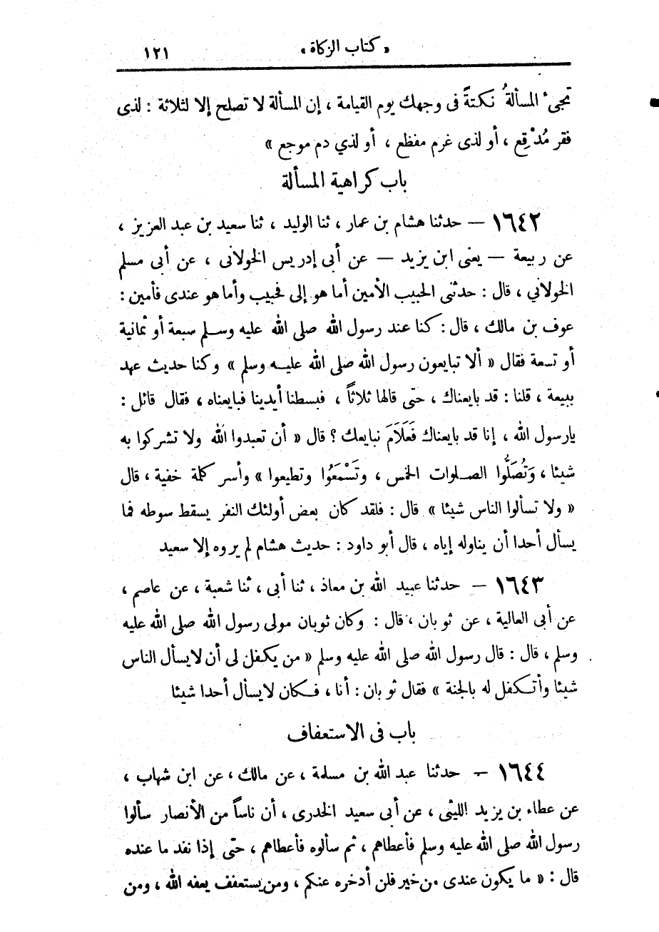 1642 - حَدَّثَنَا هِشَامُ بْنُ عَمَّارٍ، حَدَّثَنَا الْوَلِيدُ، حَدَّثَنَا سَعِيدُ بْنُ عَبْدِ الْعَزِيزِ، عَنْ رَبِيعَةَ يَعْنِي ابْنَ يَزِيدَ، عَنْ أَبِي إِدْرِيسَ الْخَوْلَانِيِّ، عَنْ أَبِي مُسْلِمٍ الْخَوْلَانِيِّ، قَالَ: حَدَّثَنِي الْحَبِيبُ الْأَمِينُ أَمَّا هُوَ إِلَيَّ فَحَبِيبٌ، وَأَمَّا هُوَ عِنْدِي فَأَمِينٌ عَوْفُ بْنُ مَالِكٍ، قَالَ: كُنَّا عِنْدَ رَسُولِ اللَّهِ صَلَّى اللهُ عَلَيْهِ وَسَلَّمَ سَبْعَةً، أَوْ ثَمَانِيَةً، أَوْ تِسْعَةً، فَقَالَ: «أَلَا تُبَايِعُونَ رَسُولَ اللَّهِ صَلَّى اللهُ عَلَيْهِ وَسَلَّمَ؟» وَكُنَّا حَدِيثَ عَهْدٍ بِبَيْعَةٍ، قُلْنَا: قَدْ بَايَعْنَاكَ، حَتَّى قَالَهَا ثَلَاثًا، فَبَسَطْنَا أَيْدِيَنَا فَبَايَعْنَاهُ، فَقَالَ قَائِلٌ: يَا رَسُولَ اللَّهِ، إِنَّا قَدْ بَايَعْنَاكَ، فَعَلَامَ نُبَايِعُكَ؟ قَالَ: «§أَنْ تَعْبُدُوا اللَّهَ وَلَا تُشْرِكُوا بِهِ شَيْئًا، وَتُصَلُّوا الصَّلَوَاتِ الْخَمْسَ، وَتَسْمَعُوا وَتُطِيعُوا»، وَأَسَرَّ كَلِمَةً خَفِيَّةً، قَالَ: «وَلَا تَسْأَلُوا النَّاسَ شَيْئًا»، قَالَ: فَلَقَدْ كَانَ بَعْضُ أُولَئِكَ النَّفَرِ يَسْقُطُ سَوْطُهُ فَمَا يَسْأَلُ أَحَدًا أَنْ يُنَاوِلَهُ إِيَّاهُ، قَالَ أَبُو دَاوُدَ: «حَدِيثُ هِشَامٍ لَمْ يَرْوِهِ إِلَّا سَعِيدٌ»