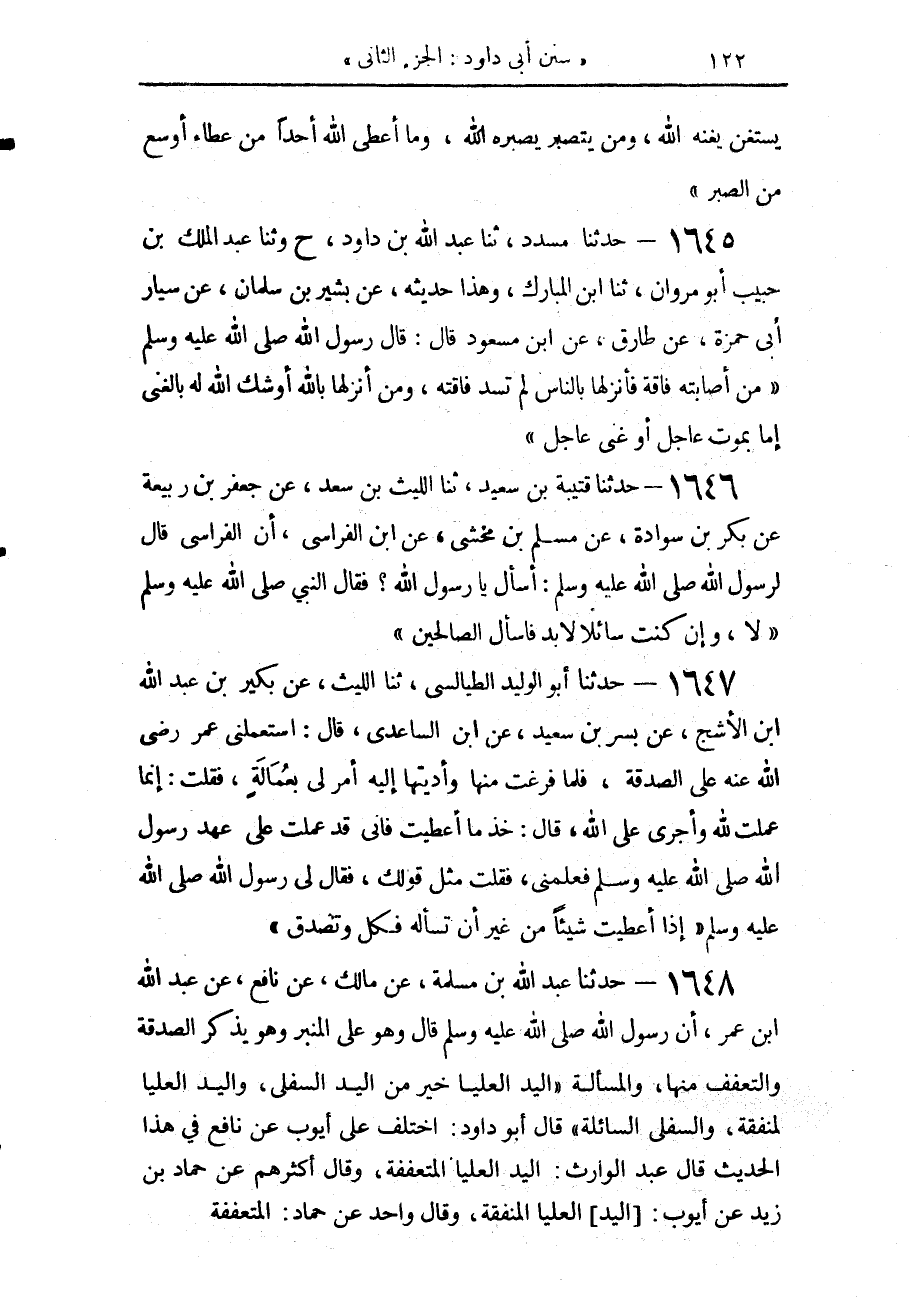 1648 - حَدَّثَنَا عَبْدُ اللَّهِ بْنُ مَسْلَمَةَ، عَنْ مَالِكٍ، عَنْ نَافِعٍ، عَنْ عَبْدِ اللَّهِ بْنِ عُمَرَ، أَنَّ رَسُولَ اللَّهِ صَلَّى اللهُ عَلَيْهِ وَسَلَّمَ قَالَ وَهُوَ عَلَى الْمِنْبَرِ، وَهُوَ يَذْكُرُ الصَّدَقَةَ، وَالتَّعَفُّفَ مِنْهَا، وَالْمَسْأَلَةَ: «§الْيَدُ الْعُلْيَا خَيْرٌ مِنَ الْيَدِ السُّفْلَى، وَالْيَدُ الْعُلْيَا الْمُنْفِقَةُ، وَالسُّفْلَى السَّائِلَةُ»، قَالَ أَبُو دَاوُدَ: اخْتُلِفَ عَلَى أَيُّوبَ، عَنْ نَافِعٍ، فِي هَذَا الْحَدِيثِ، قَالَ عَبْدُ الْوَارِثِ: الْيَدُ الْعُلْيَا الْمُتَعَفِّفَةُ، وَقَالَ: أَكْثَرُهُمْ، عَنْ حَمَّادِ بْنِ زَيْدٍ، عَنْ أَيُّوبَ، الْيَدُ الْعُلْيَا الْمُنْفِقَةُ، وَقَالَ وَاحِدٌ عَنْ حَمَّادٍ: الْمُتَعَفِّفَةُ