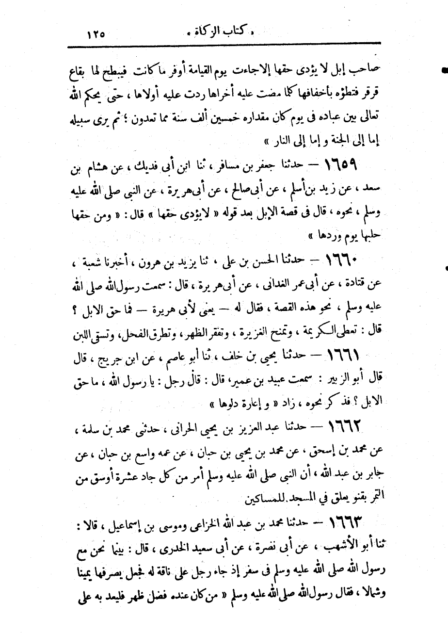 1659 - حَدَّثَنَا جَعْفَرُ بْنُ مُسَافِرٍ، حَدَّثَنَا ابْنُ أَبِي فُدَيْكٍ، عَنْ هِشَامِ بْنِ سَعْدٍ، عَنْ زَيْدِ بْنِ أَسْلَمَ، عَنْ أَبِي صَالِحٍ، عَنْ أَبِي هُرَيْرَةَ، عَنِ النَّبِيِّ صَلَّى اللهُ عَلَيْهِ وَسَلَّمَ نَحْوَهُ، قَالَ: فِي قِصَّةِ الْإِبِلِ بَعْدَ قَوْلِهِ «لَا يُؤَدِّي حَقَّهَا» قَالَ: «وَمِنْ حَقِّهَا حَلَبُهَا يَوْمَ وِرْدِهَا»،