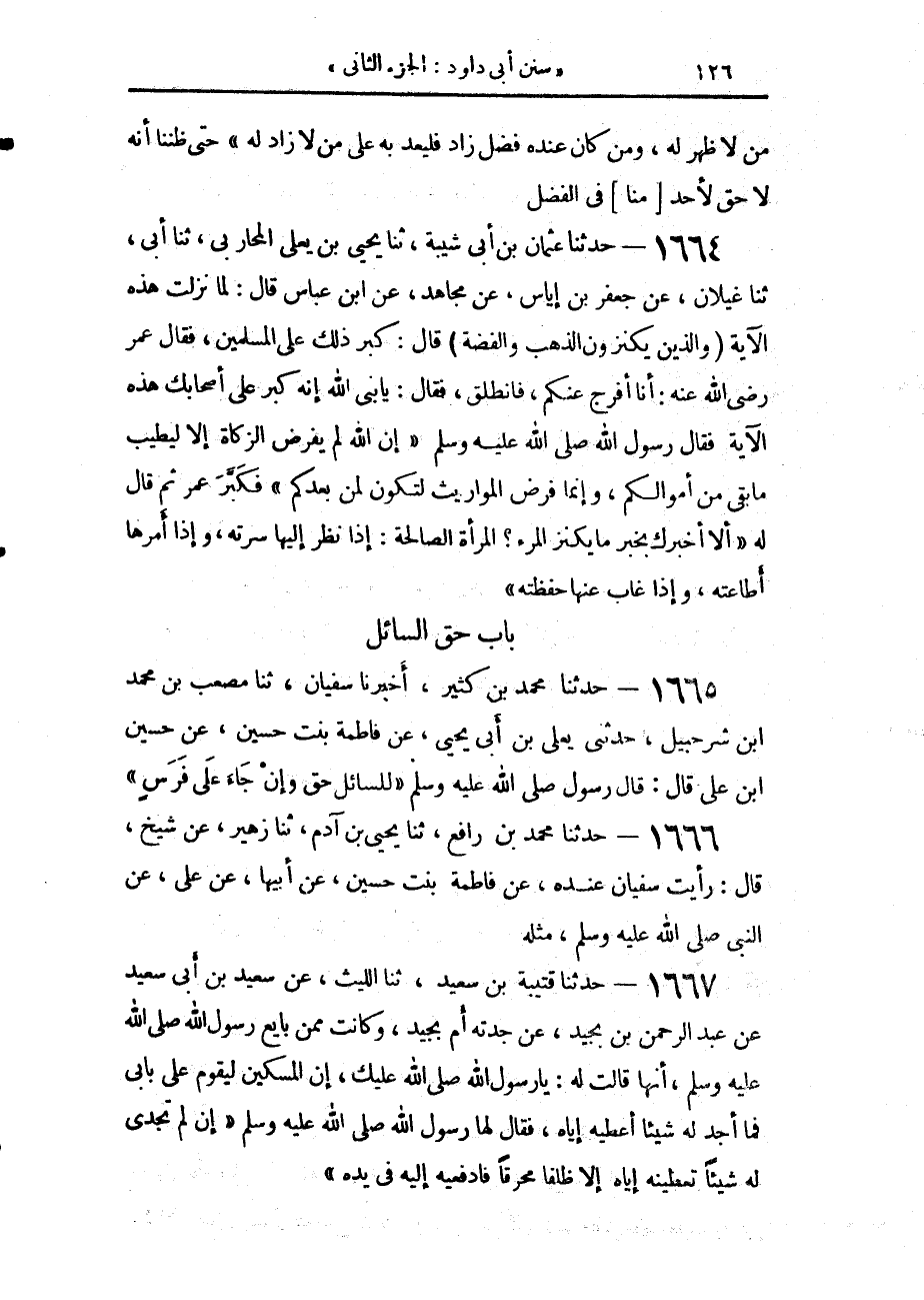1664 - حَدَّثَنَا عُثْمَانُ بْنُ أَبِي شَيْبَةَ، حَدَّثَنَا يَحْيَى بْنُ يَعْلَى الْمُحَارِبِيُّ، حَدَّثَنَا أَبِي، حَدَّثَنَا غَيْلَانُ، عَنْ جَعْفَرِ بْنِ إِيَاسٍ، عَنْ مُجَاهِدٍ، عَنِ ابْنِ عَبَّاسٍ، قَالَ: لَمَّا نَزَلَتْ هَذِهِ الْآيَةُ: {وَالَّذِينَ يَكْنِزُونَ الذَّهَبَ وَالْفِضَّةَ} [التوبة: 34]، قَالَ: كَبُرَ ذَلِكَ عَلَى الْمُسْلِمِينَ، فَقَالَ عُمَرُ رَضِيَ اللَّهُ عَنْهُ: أَنَا أُفَرِّجُ عَنْكُمْ، فَانْطَلَقَ، فَقَالَ: يَا نَبِيَّ اللَّهِ، إِنَّهُ كَبُرَ عَلَى أَصْحَابِكَ هَذِهِ الْآيَةُ، فَقَالَ رَسُولُ اللَّهِ صَلَّى اللهُ عَلَيْهِ وَسَلَّمَ: «إِنَّ §اللَّهَ لَمْ يَفْرِضِ الزَّكَاةَ، إِلَّا لِيُطَيِّبَ مَا بَقِيَ مِنْ أَمْوَالِكُمْ، وَإِنَّمَا فَرَضَ الْمَوَارِيثَ لِتَكُونَ لِمَنْ بَعْدَكُمْ»، فَكَبَّرَ عُمَرُ، ثُمَّ قَالَ لَهُ: «أَلَا أُخْبِرُكَ بِخَيْرِ مَا يَكْنِزُ الْمَرْءُ؟ الْمَرْأَةُ الصَّالِحَةُ، إِذَا نَظَرَ إِلَيْهَا سَرَّتْهُ، وَإِذَا أَمَرَهَا أَطَاعَتْهُ، وَإِذَا غَابَ عَنْهَا حَفِظَتْهُ»