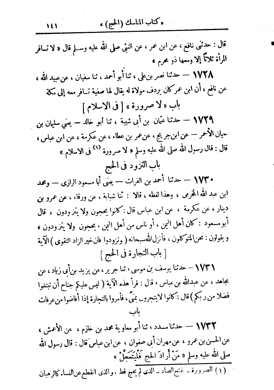 1729 - حَدَّثَنَا عُثْمَانُ بْنُ أَبِي شَيْبَةَ، حَدَّثَنَا أَبُو خَالِدٍ يَعْنِي سُلَيْمَانَ بْنَ حَيَّانَ الْأَحْمَرَ، عَنِ ابْنِ جُرَيْجٍ، عَنْ عُمَرَ بْنِ عَطَاءٍ، عَنْ عِكْرِمَةَ، عَنِ ابْنِ عَبَّاسٍ، قَالَ: قَالَ رَسُولُ اللَّهِ صَلَّى اللهُ عَلَيْهِ وَسَلَّمَ: «§لَا صَرُورَةَ فِي الْإِسْلَامِ»