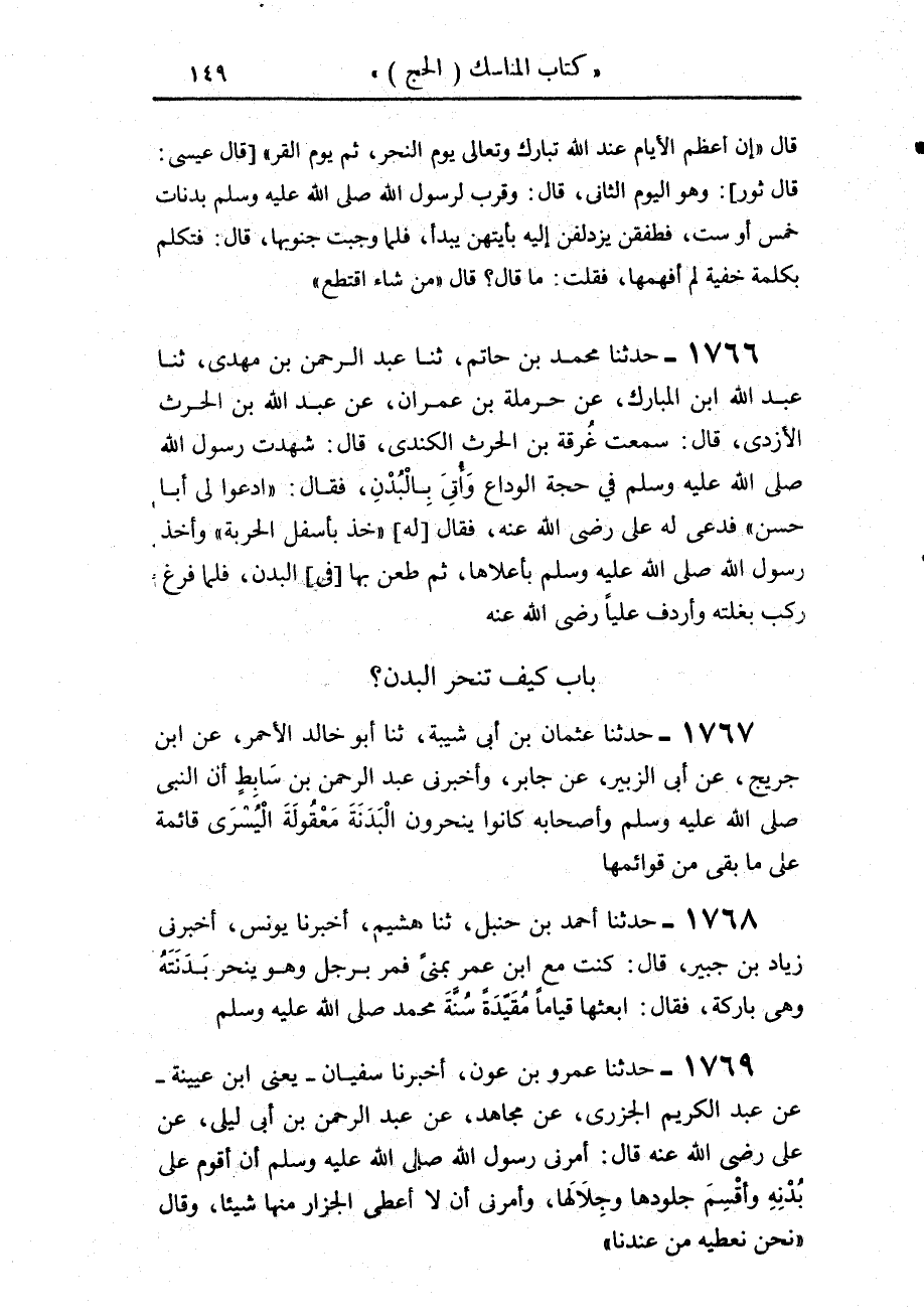 1766 - حَدَّثَنَا مُحَمَّدُ بْنُ حَاتِمٍ، حَدَّثَنَا عَبْدُ الرَّحْمَنِ بْنُ مَهْدِيٍّ، حَدَّثَنَا عَبْدُ اللَّهِ بْنُ الْمُبَارَكِ، عَنْ حَرْمَلَةَ بْنِ عِمْرَانَ، عَنْ عَبْدِ اللَّهِ بْنِ الْحَارِثِ الْأَزْدِيِّ، قَالَ: سَمِعْتُ غُرْفَةَ بْنَ الْحَارِثِ الْكِنْدِيِّ، قَالَ: شَهِدْتُ رَسُولَ اللَّهِ صَلَّى اللهُ عَلَيْهِ وَسَلَّمَ فِي حَجَّةِ الْوَدَاعِ وَأُتِيَ بِالْبُدْنِ فَقَالَ: «ادْعُوا لِي أَبَا حَسَنٍ» فَدُعِيَ لَهُ عَلِيٌّ رَضِيَ اللَّهُ عَنْهُ، فَقَالَ لَهُ: «§خُذْ بِأَسْفَلِ الْحَرْبَةِ» وَأَخَذَ رَسُولُ اللَّهِ صَلَّى اللهُ عَلَيْهِ وَسَلَّمَ بِأَعْلَاهَا، ثُمَّ طَعَنَا بِهَا فِي الْبُدْنِ فَلَمَّا فَرَغَ رَكِبَ بَغْلَتَهُ وَأَرْدَفَ عَلِيًّا رَضِيَ اللَّهُ عَنْهُ