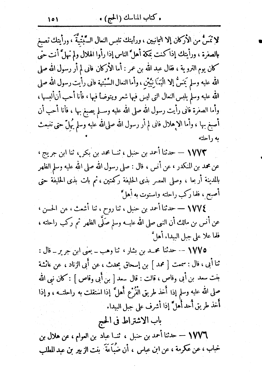 1773 - حَدَّثَنَا أَحْمَدُ بْنُ حَنْبَلٍ، حَدَّثَنَا مُحَمَّدُ بْنُ بَكْرٍ، حَدَّثَنَا ابْنُ جُرَيْجٍ، عَنْ مُحَمَّدِ بْنِ الْمُنْكَدِرِ، عَنْ أَنَسٍ، قَالَ: «§صَلَّى رَسُولُ اللَّهِ صَلَّى اللهُ عَلَيْهِ وَسَلَّمَ الظُّهْرَ بِالْمَدِينَةِ أَرْبَعًا، وَصَلَّى الْعَصْرَ بِذِي الْحُلَيْفَةِ رَكْعَتَيْنِ، ثُمَّ بَاتَ بِذِي الْحُلَيْفَةِ حَتَّى أَصْبَحَ، فَلَمَّا رَكِبَ رَاحِلَتَهُ وَاسْتَوَتْ بِهِ أَهَلَّ»