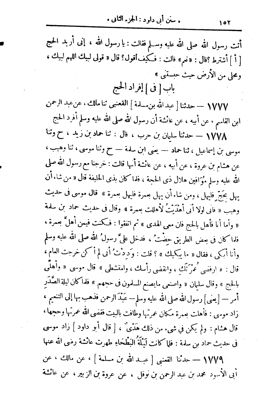 1777 - حَدَّثَنَا عَبْدُ اللَّهِ بْنُ مَسْلَمَةَ الْقَعْنَبِيُّ، حَدَّثَنَا مَالِكٌ، عَنْ عَبْدِ الرَّحْمَنِ بْنِ الْقَاسِمِ، عَنْ أَبِيهِ، عَنْ عَائِشَةَ، أَنَّ رَسُولَ اللَّهِ صَلَّى اللهُ عَلَيْهِ وَسَلَّمَ «§أَفْرَدَ الْحَجَّ»