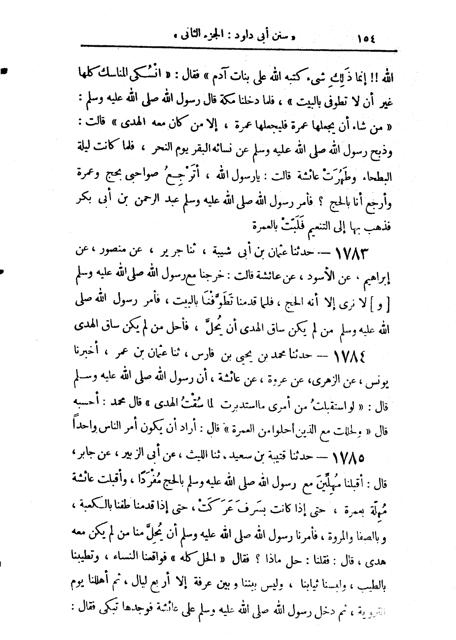 1785 - حَدَّثَنَا قُتَيْبَةُ بْنُ سَعِيدٍ، حَدَّثَنَا اللَّيْثُ، عَنْ أَبِي الزُّبَيْرِ، عَنْ جَابِرٍ، قَالَ: أَقْبَلْنَا مُهِلِّينَ مَعَ رَسُولِ اللَّهِ صَلَّى اللهُ عَلَيْهِ وَسَلَّمَ بِالْحَجِّ مُفْرَدًا، وَأَقْبَلَتْ عَائِشَةُ مُهِلَّةً بِعُمْرَةٍ حَتَّى إِذَا كَانَتْ بِسَرِفَ عَرَكَتْ حَتَّى إِذَا قَدِمْنَا طُفْنَا بِالْكَعْبَةِ وَبِالصَّفَا وَالْمَرْوَةِ، فَأَمَرَنَا رَسُولُ اللَّهِ صَلَّى اللهُ عَلَيْهِ وَسَلَّمَ أَنْ يُحِلَّ مِنَّا مَنْ لَمْ يَكُنْ مَعَهُ هَدْيٌ، قَالَ: فَقُلْنَا: حِلُّ مَاذَا؟ فَقَالَ «الْحِلُّ كُلُّهُ» فَوَاقَعْنَا النِّسَاءَ، وَتَطَيَّبْنَا بِالطِّيبِ، وَلَبِسْنَا ثِيَابَنَا، وَلَيْسَ بَيْنَنَا وَبَيْنَ عَرَفَةَ إِلَّا أَرْبَعُ لَيَالٍ، ثُمَّ أَهْلَلْنَا يَوْمَ التَّرْوِيَةِ، ثُمَّ دَخَلَ رَسُولُ اللَّهِ صَلَّى اللهُ عَلَيْهِ وَسَلَّمَ عَلَى عَائِشَةَ فَوَجَدَهَا تَبْكِي فَقَالَ -[155]-: «مَا شَأْنُكِ؟» قَالَتْ: شَأْنِي أَنِّي قَدْ حِضْتُ، وَقَدْ حَلَّ النَّاسُ وَلَمْ أَحْلُلْ، وَلَمْ أَطُفْ بِالْبَيْتِ وَالنَّاسُ يَذْهَبُونَ إِلَى الْحَجِّ الْآنَ، فَقَالَ: «إِنَّ §هَذَا أَمْرٌ كَتَبَهُ اللَّهُ عَلَى بَنَاتِ آدَمَ فَاغْتَسِلِي، ثُمَّ أَهِلِّي بِالْحَجِّ» فَفَعَلَتْ، وَوَقَفَتِ الْمَوَاقِفَ حَتَّى إِذَا طَهُرَتْ طَافَتْ بِالْبَيْتِ وَبِالصَّفَا وَالْمَرْوَةِ، ثُمَّ قَالَ: «قَدْ حَلَلْتِ مِنْ حَجِّكِ وَعُمْرَتِكِ جَمِيعًا» قَالَتْ: يَا رَسُولَ اللَّهِ، إِنِّي أَجِدُ فِي نَفْسِي أَنِّي لَمْ أَطُفْ بِالْبَيْتِ حِينَ حَجَجْتُ قَالَ: «فَاذْهَبْ بِهَا يَا عَبْدَ الرَّحْمَنِ فَأَعْمِرْهَا مِنَ التَّنْعِيمِ» وَذَلِكَ لَيْلَةُ الْحَصْبَةِ.