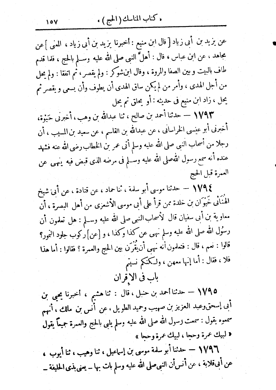 1795 - حَدَّثَنَا أَحْمَدُ بْنُ حَنْبَلٍ، قَالَ: حَدَّثَنَا هُشَيْمٌ، أَخْبَرَنَا يَحْيَى بْنُ أَبِي إِسْحَاقَ، وَعَبْدُ الْعَزِيزِ بْنُ صُهَيْبٍ، وَحُمَيْدٌ الطَّوِيلُ، عَنْ أَنَسِ بْنِ مَالِكٍ، أَنَّهُم سَمِعُوهُ يَقُولُ: سَمِعْتُ رَسُولَ اللَّهِ صَلَّى اللهُ عَلَيْهِ وَسَلَّمَ يُلَبِّي بِالْحَجِّ وَالْعُمْرَةِ جَمِيعًا، يَقُولُ: «§لَبَّيْكَ عُمْرَةً وَحَجًّا، لَبَّيْكَ عُمْرَةً وَحَجًّا»