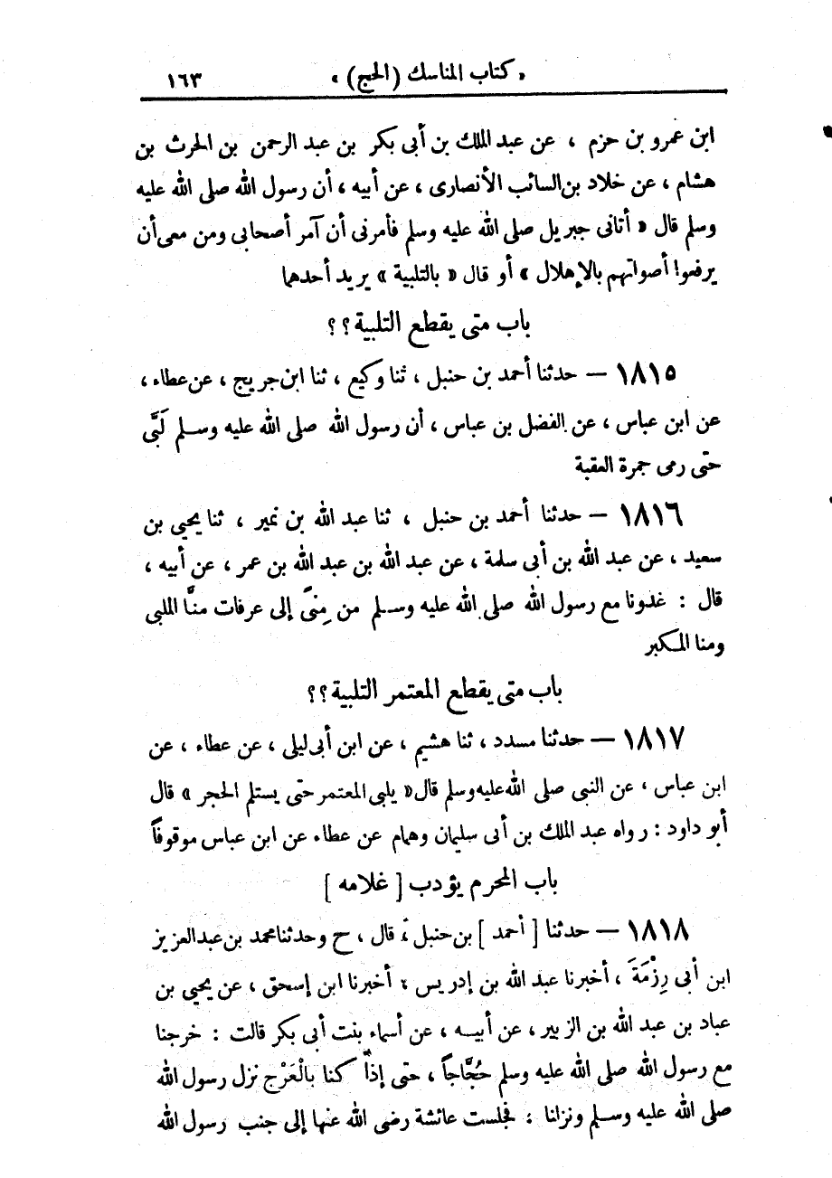 1815 - حَدَّثَنَا أَحْمَدُ بْنُ حَنْبَلٍ، حَدَّثَنَا وَكِيعٌ، حَدَّثَنَا ابْنُ جُرَيْجٍ، عَنْ عَطَاءٍ، عَنِ ابْنِ عَبَّاسٍ، عَنِ الْفَضْلِ بْنِ عَبَّاسٍ، أَنَّ رَسُولَ اللَّهِ صَلَّى اللهُ عَلَيْهِ وَسَلَّمَ «§لَبَّى حَتَّى رَمَى جَمْرَةَ الْعَقَبَةِ»