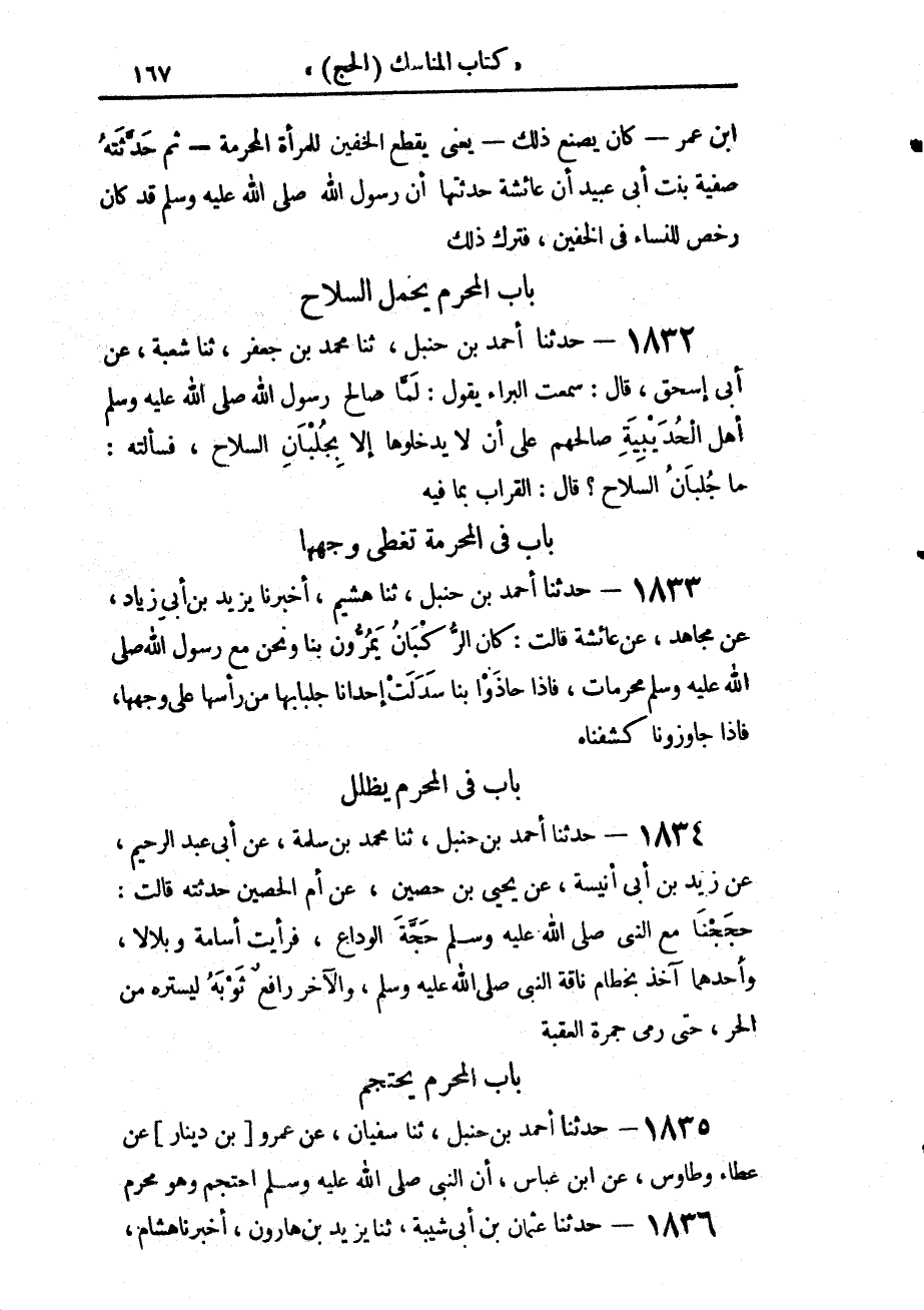 1834 - حَدَّثَنَا أَحْمَدُ بْنُ حَنْبَلٍ، حَدَّثَنَا مُحَمَّدُ بْنُ سَلَمَةَ، عَنْ أَبِي عَبْدِ الرَّحِيمِ، عَنْ زَيْدِ بْنِ أَبِي أُنَيْسَةَ، عَنْ يَحْيَى بْنِ حُصَيْنٍ، عَنْ أُمِّ الْحُصَيْنِ، حَدَّثَتْهُ قَالَتْ: «§حَجَجْنَا مَعَ النَّبِيِّ صَلَّى اللهُ عَلَيْهِ وَسَلَّمَ حَجَّةَ الْوَدَاعِ فَرَأَيْتُ أُسَامَةَ وَبِلَالًا وَأَحَدُهُمَا آخِذٌ بِخِطَامِ نَاقَةِ النَّبِيِّ صَلَّى اللهُ عَلَيْهِ وَسَلَّمَ وَالْآخَرُ رَافِعٌ ثَوْبَهُ لِيَسْتُرَهُ مِنَ الْحَرِّ حَتَّى رَمَى جَمْرَةَ الْعَقَبَةِ»