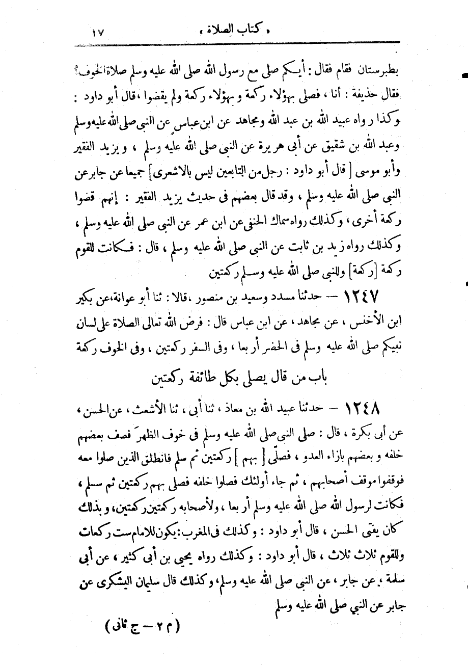 1248 - حَدَّثَنَا عُبَيْدُ اللَّهِ بْنُ مُعَاذٍ، حَدَّثَنَا أَبِي، حَدَّثَنَا الْأَشْعَثُ، عَنِ الْحَسَنِ، عَنْ أَبِي بَكْرَةَ، قَالَ: «§صَلَّى النَّبِيُّ صَلَّى اللهُ عَلَيْهِ وَسَلَّمَ فِي خَوْفٍ الظُّهْرَ، فَصَفَّ بَعْضُهُمْ خَلْفَهُ، وَبَعْضُهُمْ بِإِزَاءِ الْعَدُوِّ، فَصَلَّى بِهِمْ رَكْعَتَيْنِ، ثُمَّ سَلَّمَ فَانْطَلَقَ الَّذِينَ صَلَّوْا مَعَهُ، فَوَقَفُوا مَوْقِفَ أَصْحَابِهِمْ، ثُمَّ جَاءَ أُولَئِكَ فَصَلَّوْا خَلْفَهُ، فَصَلَّى بِهِمْ رَكْعَتَيْنِ، ثُمَّ سَلَّمَ، فَكَانَتْ لِرَسُولِ اللَّهِ صَلَّى اللهُ عَلَيْهِ وَسَلَّمَ أَرْبَعًا، وَلِأَصْحَابِهِ رَكْعَتَيْنِ رَكْعَتَيْنِ»، «وَبِذَلِكَ كَانَ يُفْتِي الْحَسَنُ»، قَالَ أَبُو دَاوُدَ: «وَكَذَلِكَ فِي الْمَغْرِبِ يَكُونُ لِلْإِمَامِ سِتُّ رَكَعَاتٍ، وَلِلْقَوْمِ ثَلَاثٌ ثَلَاثٌ»، قَالَ أَبُو دَاوُدَ: وَكَذَلِكَ رَوَاهُ يَحْيَى بْنُ أَبِي كَثِيرٍ، عَنْ أَبِي سَلَمَةَ، عَنْ جَابِرٍ، عَنِ النَّبِيِّ صَلَّى اللهُ عَلَيْهِ وَسَلَّمَ، وَكَذَلِكَ قَالَ سُلَيْمَانُ الْيَشْكُرِيُّ: عَنْ جَابِرٍ، عَنِ النَّبِيِّ صَلَّى اللهُ عَلَيْهِ وَسَلَّمَ