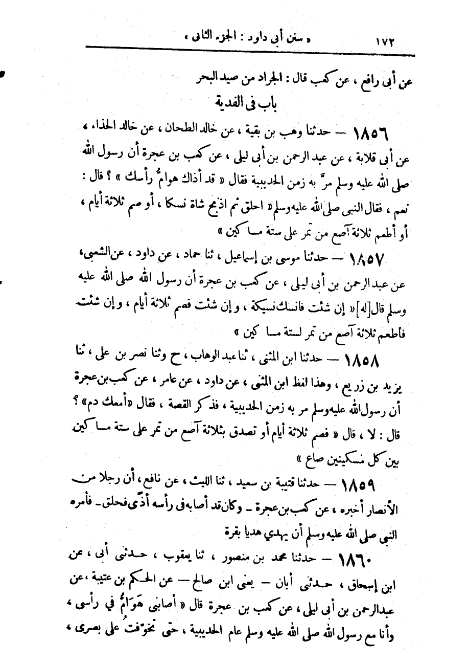 1856 - حَدَّثَنَا وَهْبُ بْنُ بَقِيَّةَ، عَنْ خَالِدٍ الطَّحَّانِ، عَنْ خَالِدٍ الْحَذَّاءِ، عَنْ أَبِي قِلَابَةَ، عَنْ عَبْدِ الرَّحْمَنِ بْنِ أَبِي لَيْلَى، عَنْ كَعْبِ بْنِ عُجْرَةَ، أَنَّ رَسُولَ اللَّهِ صَلَّى اللهُ عَلَيْهِ وَسَلَّمَ مَرَّ بِهِ زَمَنَ الْحُدَيْبِيَةِ فَقَالَ: قَدْ آذَاكَ هَوَامُّ رَأْسِكَ قَالَ: نَعَمْ، فَقَالَ النَّبِيُّ صَلَّى اللهُ عَلَيْهِ وَسَلَّمَ: «§احْلِقْ، ثُمَّ اذْبَحْ شَاةً نُسُكًا، أَوْ صُمْ ثَلَاثَةَ أَيَّامٍ، أَوْ أَطْعِمْ ثَلَاثَةَ آصُعٍ مِنْ تَمْرٍ عَلَى سِتَّةِ مَسَاكِينَ»