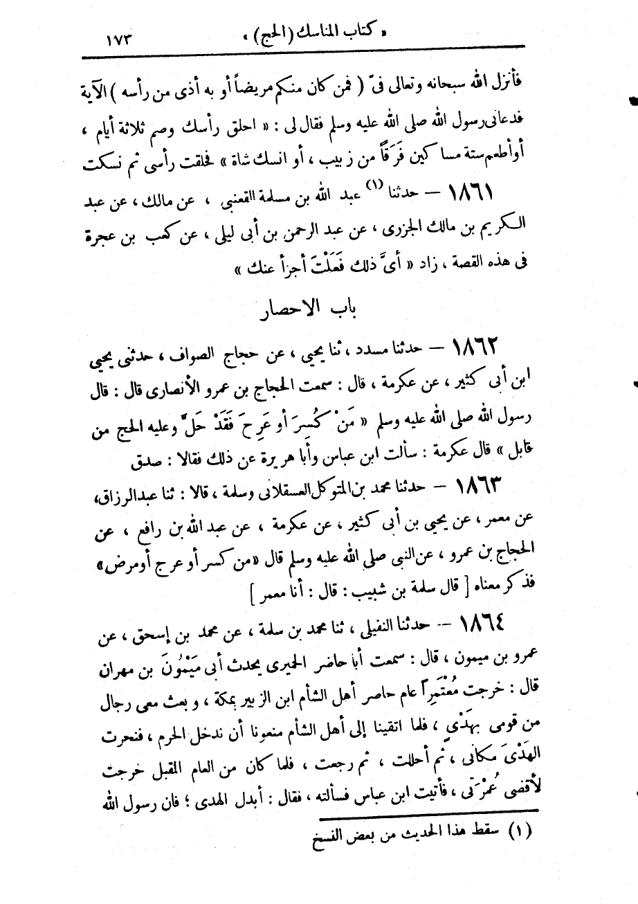 1863 - حَدَّثَنَا مُحَمَّدُ بْنُ الْمُتَوَكِّلِ الْعَسْقَلَانِيُّ، وَسَلَمَةُ، قَالَا: حَدَّثَنَا عَبْدُ الرَّزَّاقِ، عَنْ مَعْمَرٍ، عَنْ يَحْيَى بْنِ أَبِي كَثِيرٍ، عَنْ عِكْرِمَةَ، عَنْ عَبْدِ اللَّهِ بْنِ رَافِعٍ، عَنِ الْحَجَّاجِ بْنِ عَمْرٍو، عَنِ النَّبِيِّ صَلَّى اللهُ عَلَيْهِ وَسَلَّمَ قَالَ: مَنْ كُسِرَ أَوْ عَرِجَ أَوْ مَرِضَ فَذَكَرَ مَعْنَاهُ، قَالَ: سَلَمَةُ بْنُ شَبِيبٍ قَالَ: أَنْبَأَنَا مَعْمَرٌ